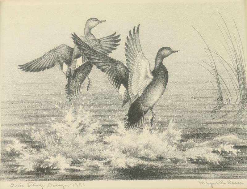 Duck Stamp Design 1951 by Maynard Reece includes print and $2 stamp, hand signed by artist. Double mat and frame image size is 91/2"X7".
