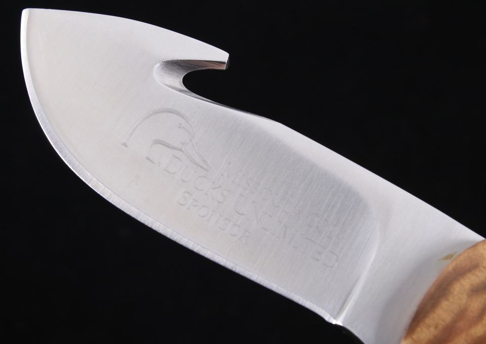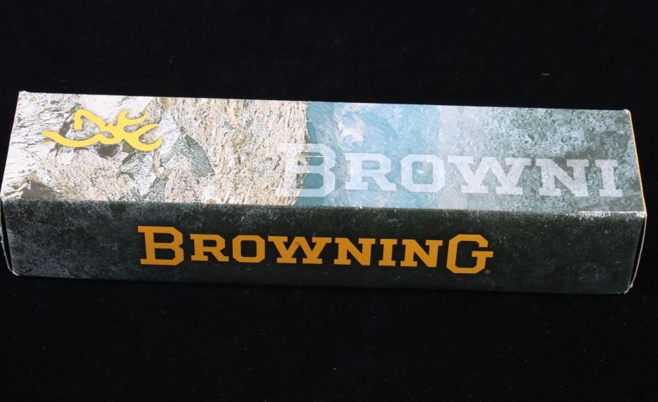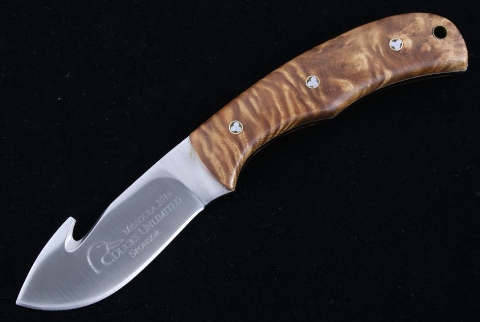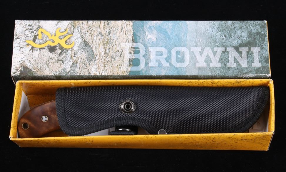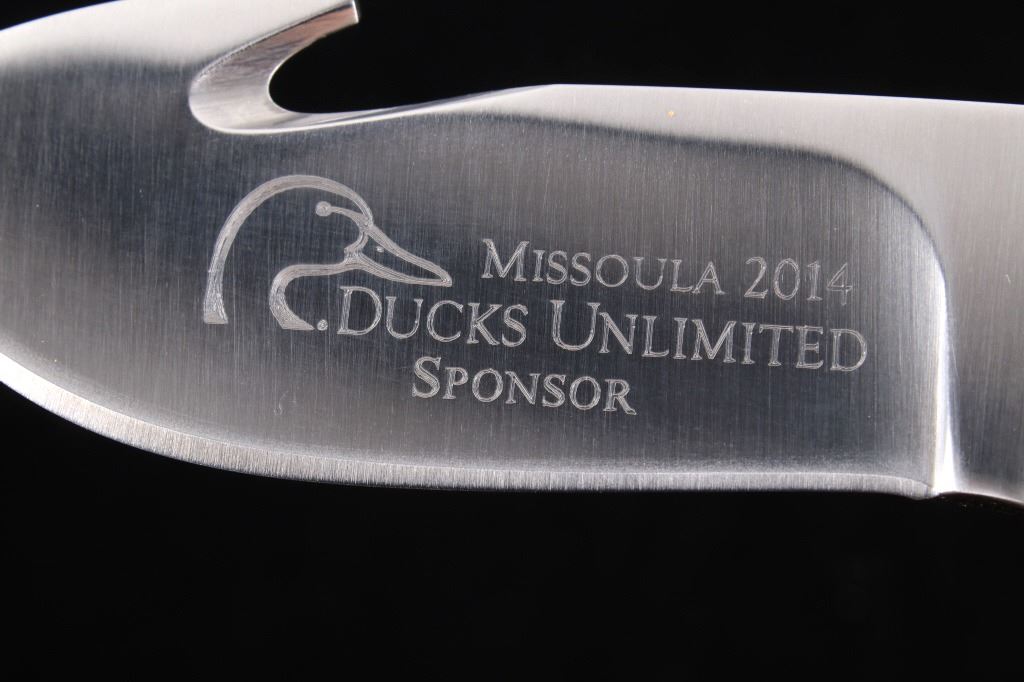 Available in this lot we have a Duck Unlimited limited edition Browning skinning knife and original box. The knife displays a stainless steel fixed blade with a gut hook along the back of the tip. The knife blade is marked in engraved lettering reading "Missoula 2014 Ducks Unlimited Sponsor" with a outline of a ducks head and "Model 775 China". The grip displays a wood burl handle with three mosaic pins. The knife comes with a nylon sheath and its original Browning box. The knife shows good condition overall with no visible wear. The knife measures 8" long with a 3 1/2" long blade.