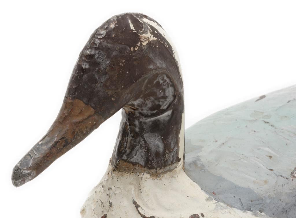 Duck decoy lot consisting of an old carved wood decoy with lead weight, approx. 16” x 7-1/2” x 10” with considerable black and white paint remaining (appears original) and in overall fair to good condition; also an all metal old decoy, approx. 18-1/2” x 5” x 7-1/2” with the majority of its original appearing paint of blue, black brown and white; also an interesting old canvas covered decoy with glass eyes, approx. 14” x 5” x 6” in very good condition; plus a black, white and red painted decoy with glass eyes, approx. 17” x 6-1/2” x 8” in very good condition. With this lot is included a carved wood decoy head with glass eyes, approx. 6” long, 2” wide and 5” tall. Est.: $300-$500.