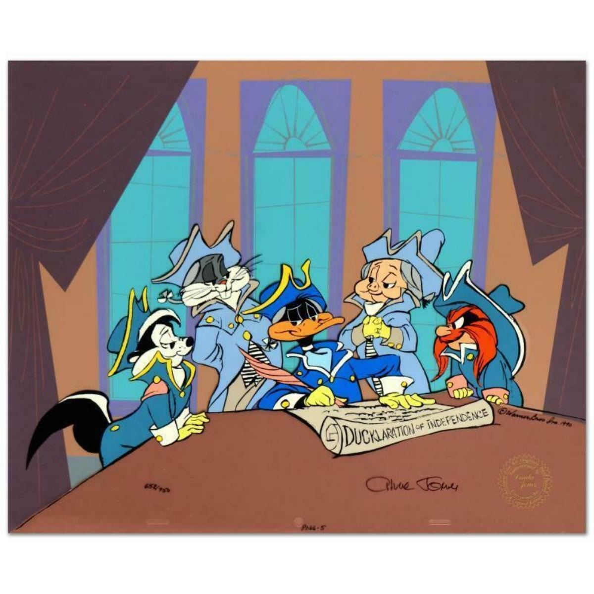 "Ducklaration of Independence" is a SOLD OUT limited edition animation cel with hand painted color on sericel outline, dated (1990), numbered and hand signed by Chuck Jones (1912-2002)! The sericel comes with a brilliant full-color background and bears the official seal of Linda Jones Enterprises. Measures approx. 16.5" x 13.5" (background); 15" x 8" (image).