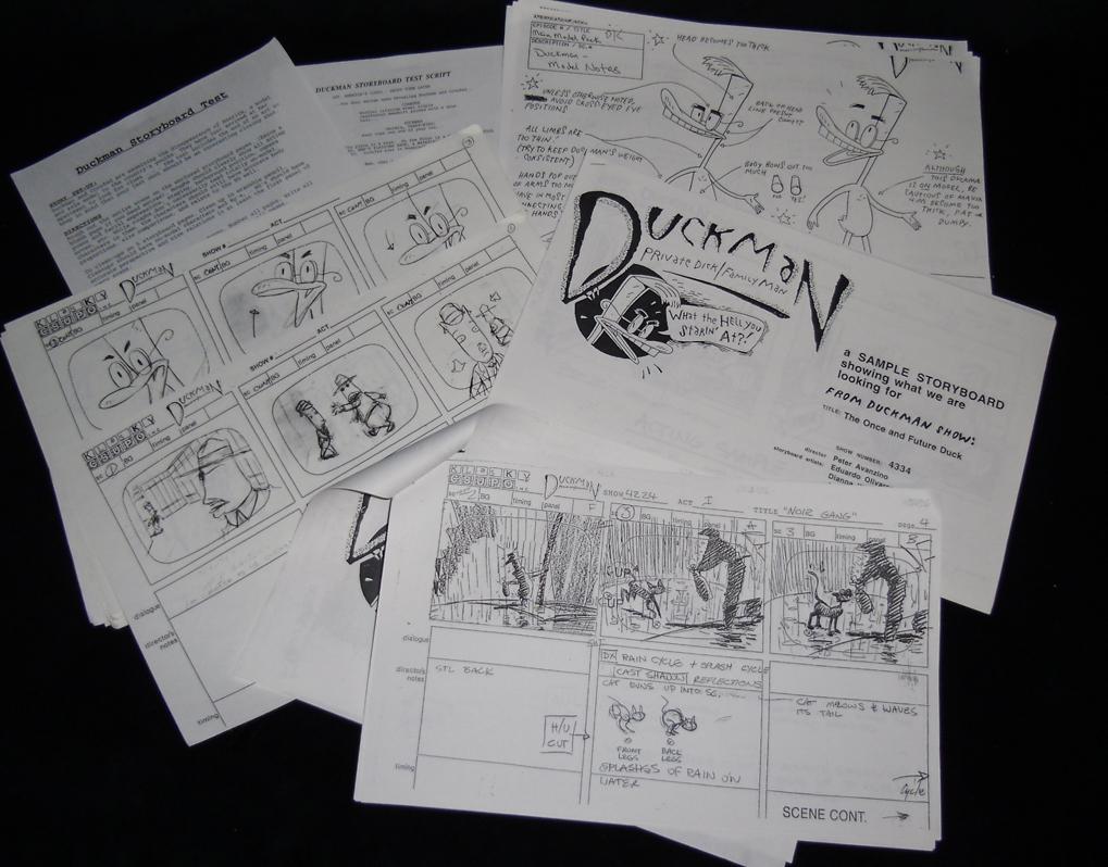 Duckman (Private Dick / Family Man) Animated Series - A production copy of storyboard packets for episode # 4334 "The Once and Future Duck" and episode #4224 "Noir Gang" from Klasky Csupo Ince. Various test notes and artwork. 8.5" x 14"