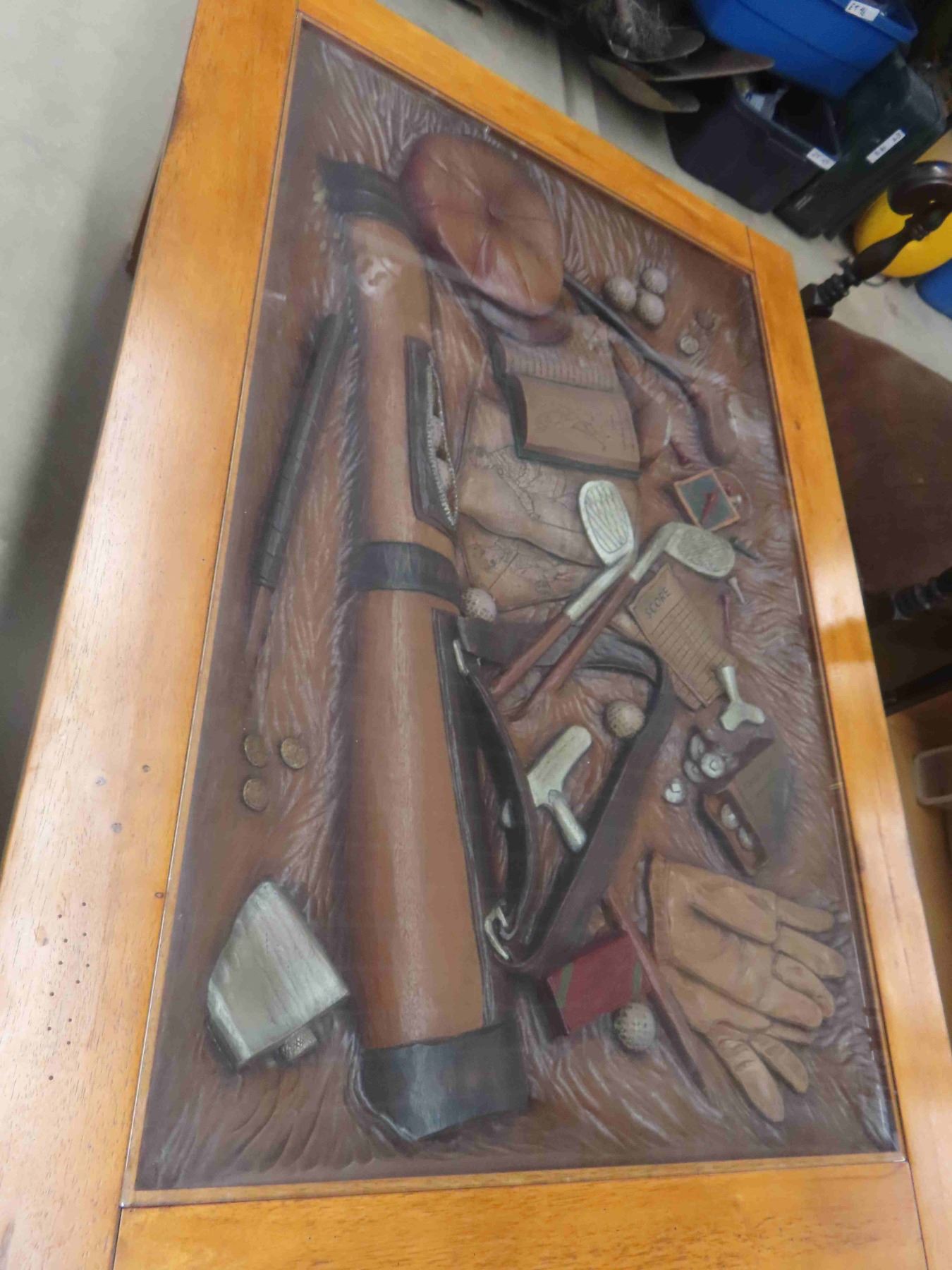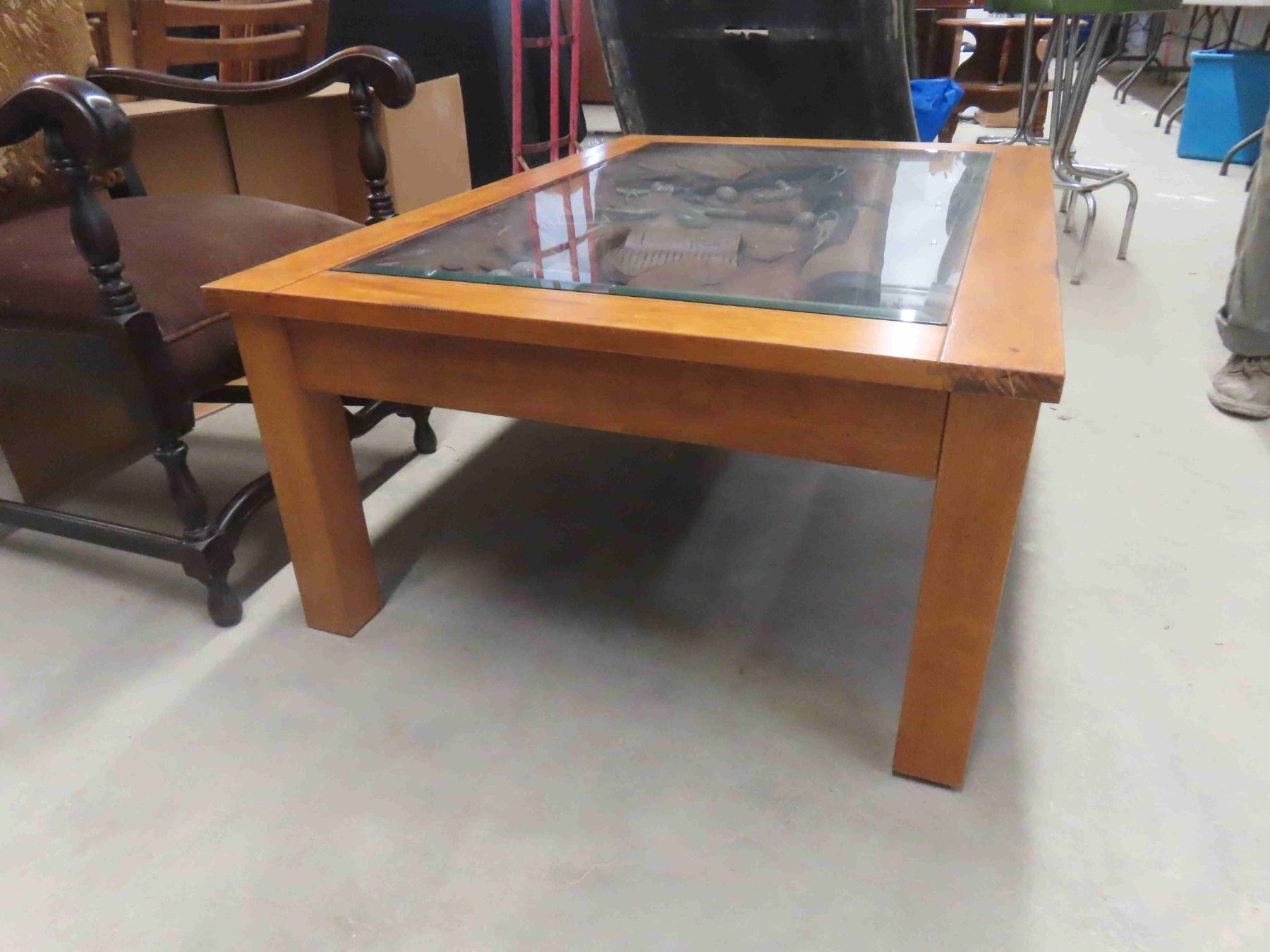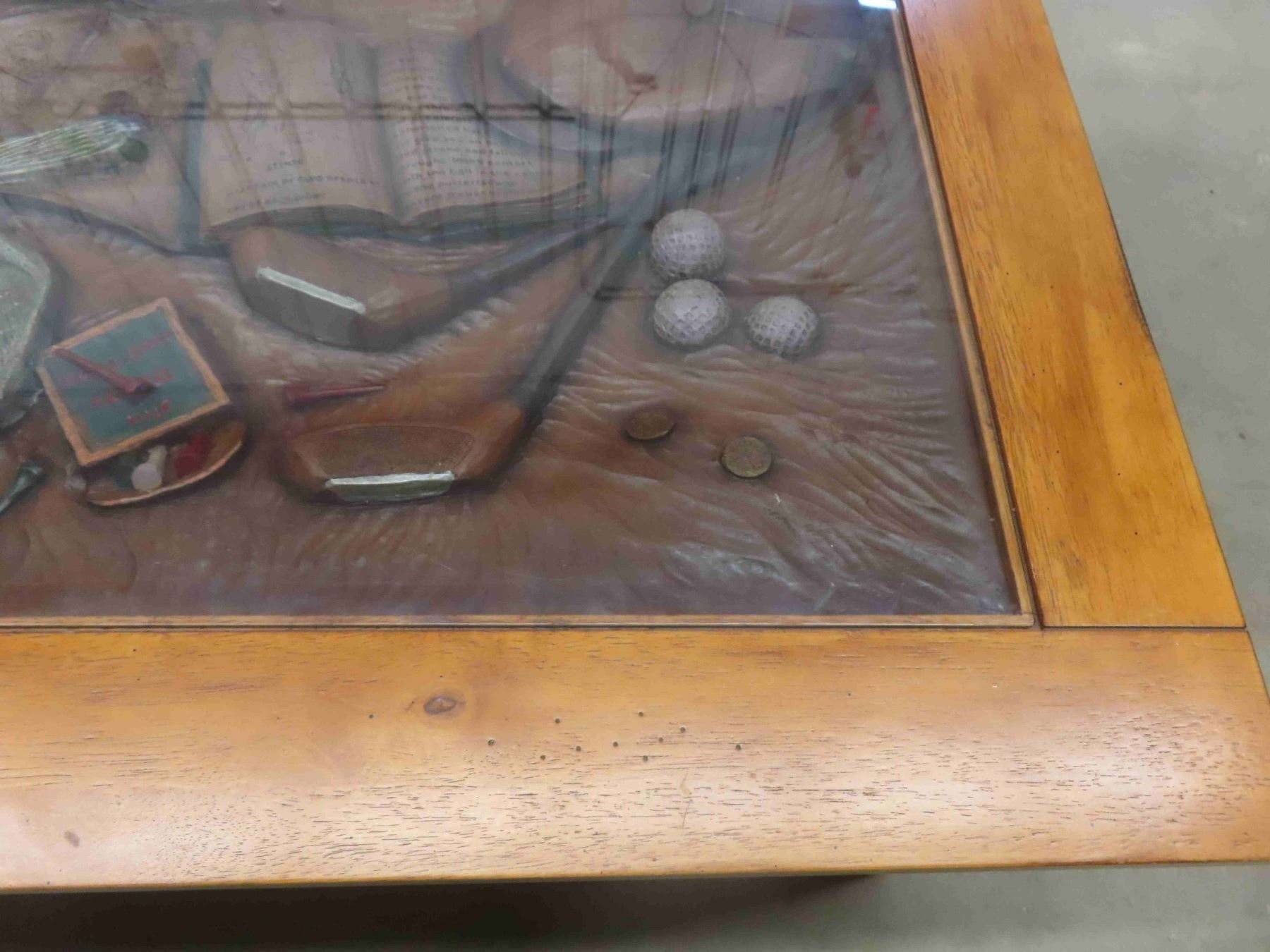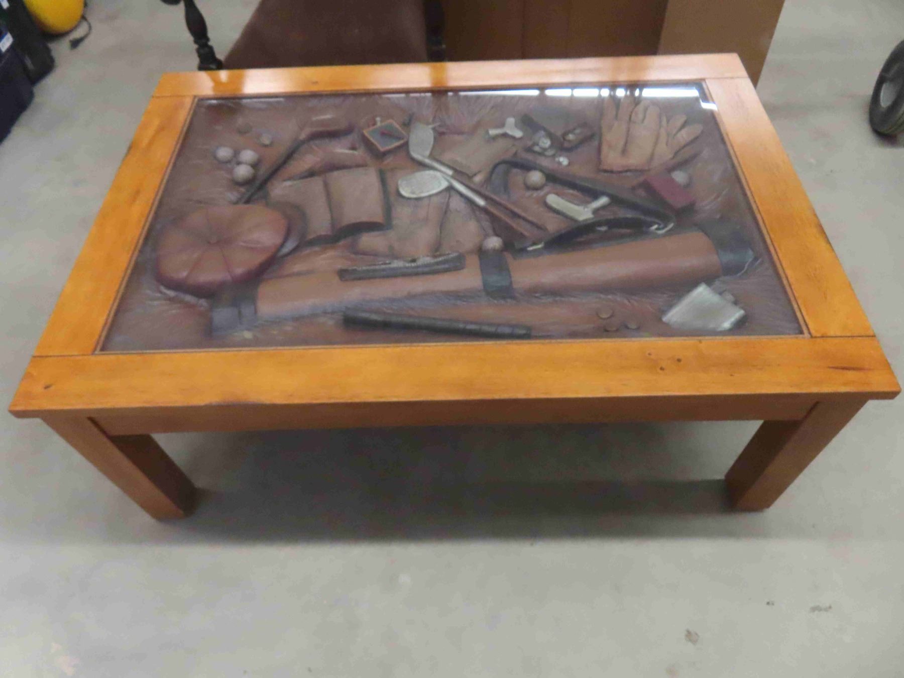 Ducks Unlimited Unique Oak Coffee Table with Glass Top Displaying Everything a Golfer Needs 33 1/2'' x 49'' x 18 1/2''