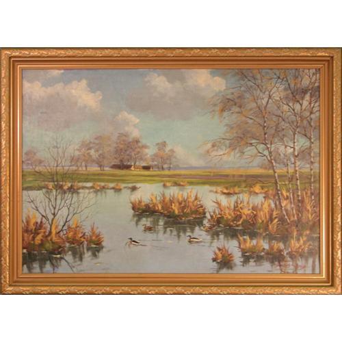 This remarkably talented Danish artist, Svend Jensen, has created a magnificently original country scene with a wonderful sense of perspective. The warm tones that are used produce glorious feelings one would find on a crisp autumn day. The brushwork is visible, and yet subtle, so as not to detract from the beauteous scene itself. The clouds are thick and fantastically shaded to create three dimensional forms that look real. One feels like they could walk through the piece it is so inviting. The unique gold wood frame the surrounds this work of art is the perfect mix of country charm and elegance, emulating the golden hues found in the painting. In its entirety, this piece?s dimensions are 29 ¼? x 21 ¼?, which also includes the frame in this measurement. In the lower right hand corner of the piece is the artist?s signature. This painting is an excellent buy when considering the high quality of the art work itself.