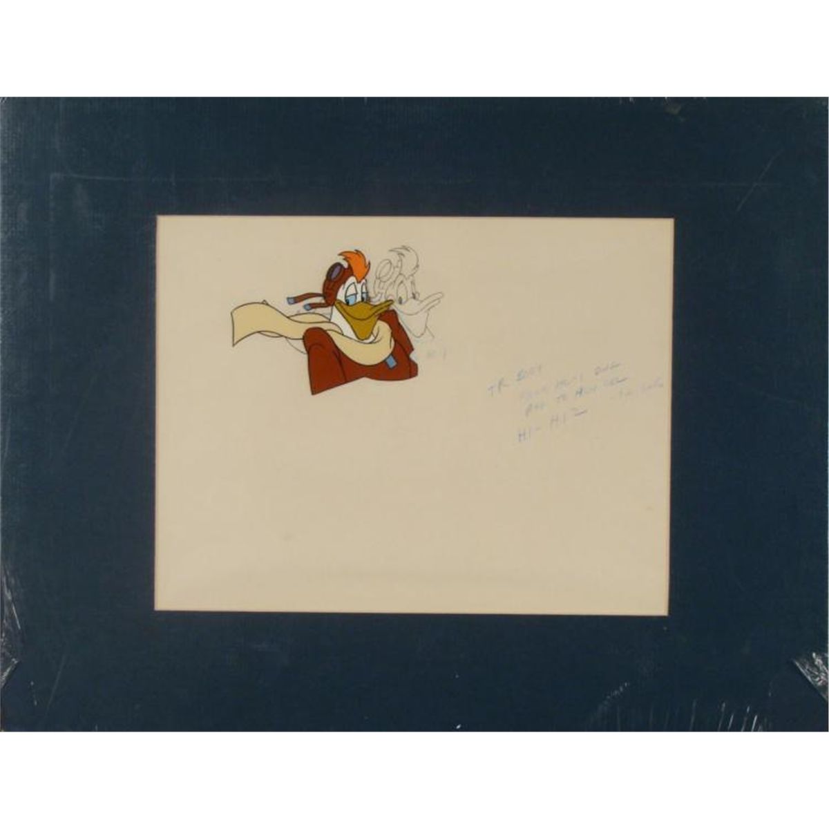 Here is an original animation cel and matching drawing used in the production of the Disney animated series Ducktales. Show here is Launchpad McQuack, making one of his earliest appearances as Scrooge McDuck's pilot. * Medium: Hand-inked and hand-painted acetate cel; black pencil on animator's paper, with notations in blue pencilPresentation: Matted in blue matteImage size: 11 x 8 1/2 inchesMatte size: 18 x 14 inchesCondition: Excellent; sealed in cellophaneCertificate of Authenticity: Included