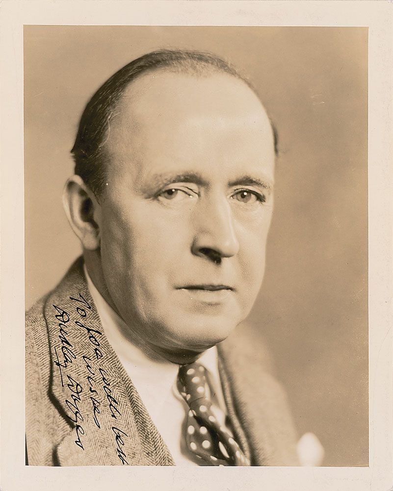 Irish stage and film actor (1879–1947) who appeared in over 40 films, including the original Maltese Falcon, and especially memorable as the Chief Detective in the horror classic, The Invisible Man. Vintage glossy 8 x 10 doubleweight head-and-shoulders photo, signed and inscribed vertically in fountain pen “To Joe, with best wishes, Dudley Digges.” In fine condition, with some scattered light surface marks and dings, and irregular emulsion to left edge.