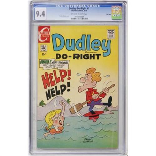 <B>Dudley Do-Right #1 File Copy (Charlton, 1970) CGC NM 9.4 Off-white to white pages.</B></I> CGC hasn't awarded a higher grade for this issue. Overstreet 2008 NM- 9.2 value = $135. CGC census 4/08: 3 in 9.4, none higher.<BR><BR><b>Shipping:</b> Comics - Slabbed (certified) (<a target="_blank" href="http://www.heritageauctions.com/common/shipping.php">view shipping information</a>)