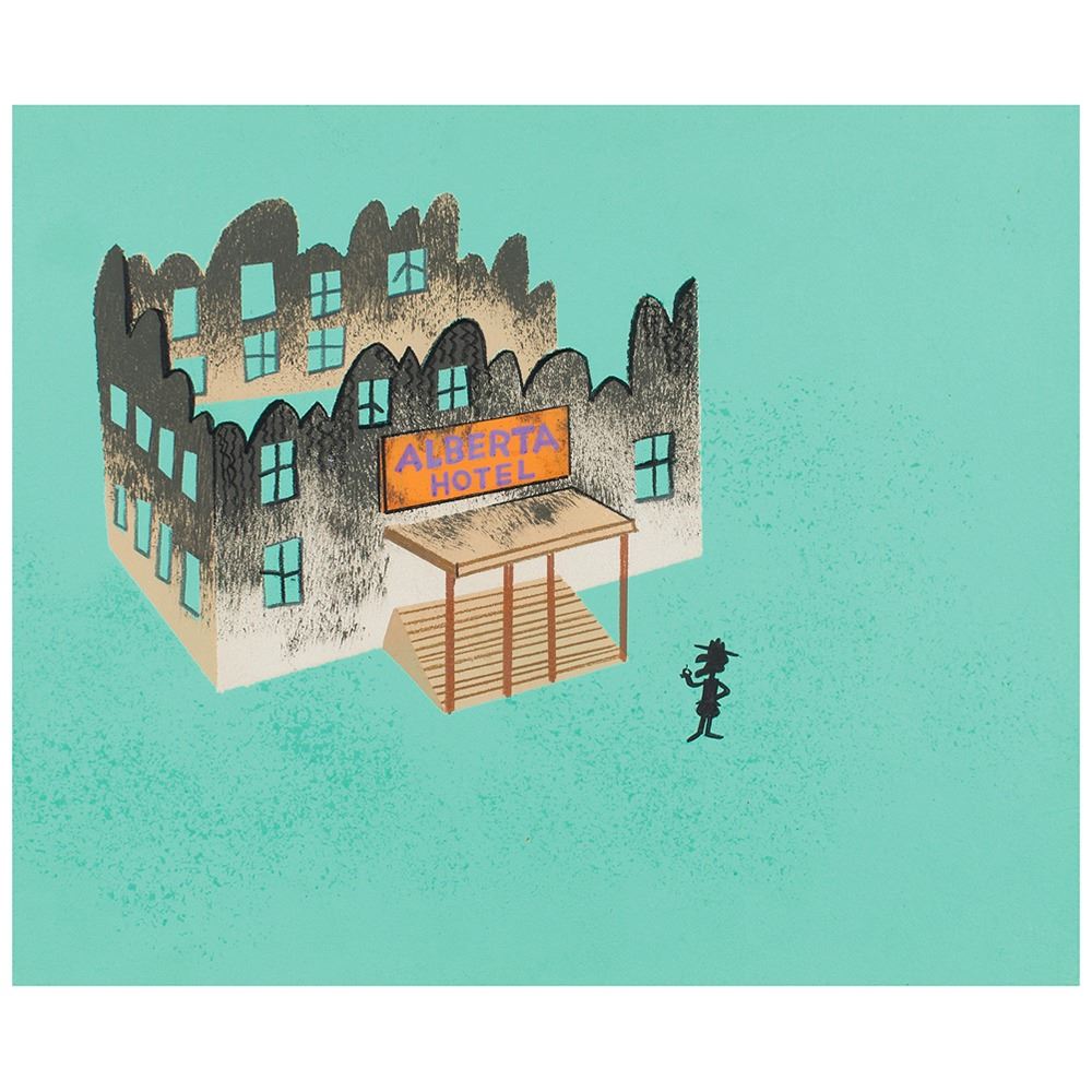 (Jay Ward Productions, 1959) Vibrant original hand-painted production background featuring Dudley Do-Right from The Disloyal Canadians, showing his silhouette outside the Alberta Hotel in the very first episode of the Dudley Do-Right of the Mounties series. The episode originally aired as a segment in The Adventures of Rocky and Bullwinkle and Friends (Season 1, Episode 11). In his attempts to stop Snidely Whiplash, Dudley Do-Right only manages to blow up a dam and burn down the Alberta Hotel—the charred remains of which are seen in this vividly hand-painted production piece. Accomplished in gouache on a 9.75 x 8 sheet of artist's cardstock. In fine condition.