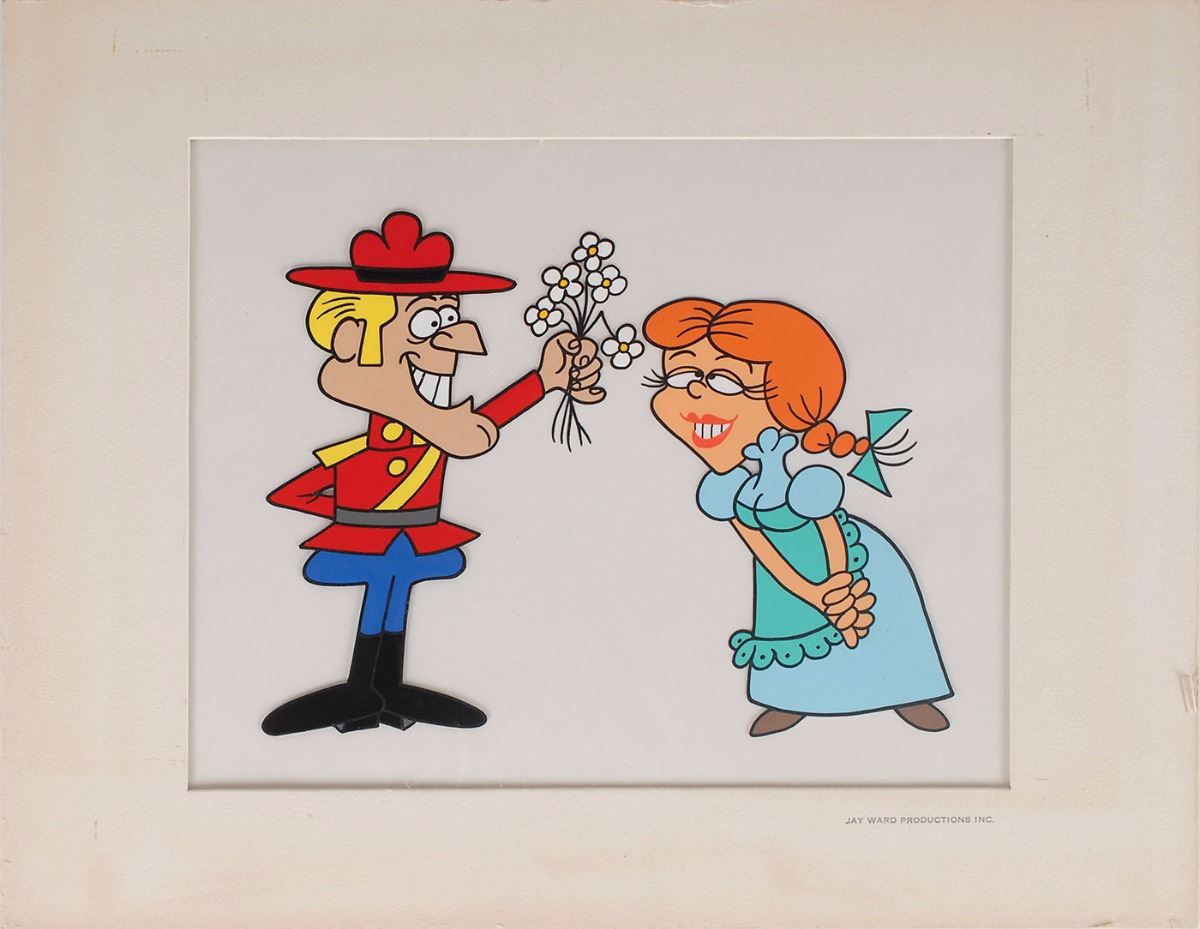 (Jay Ward Productions, circa 1970s) Original publicity cel featuring Dudley Do-Right from The Dudley Do-Right Show, showing Dudley offering daisies to Nell Fenwick. Images measure 4 x 5.5 and 3.25 x 4.75, with a mat opening of 8.75 x 7. Original Jay Ward Productions mat measures 13 x 10. In fine condition, with toning and some dings to mat.