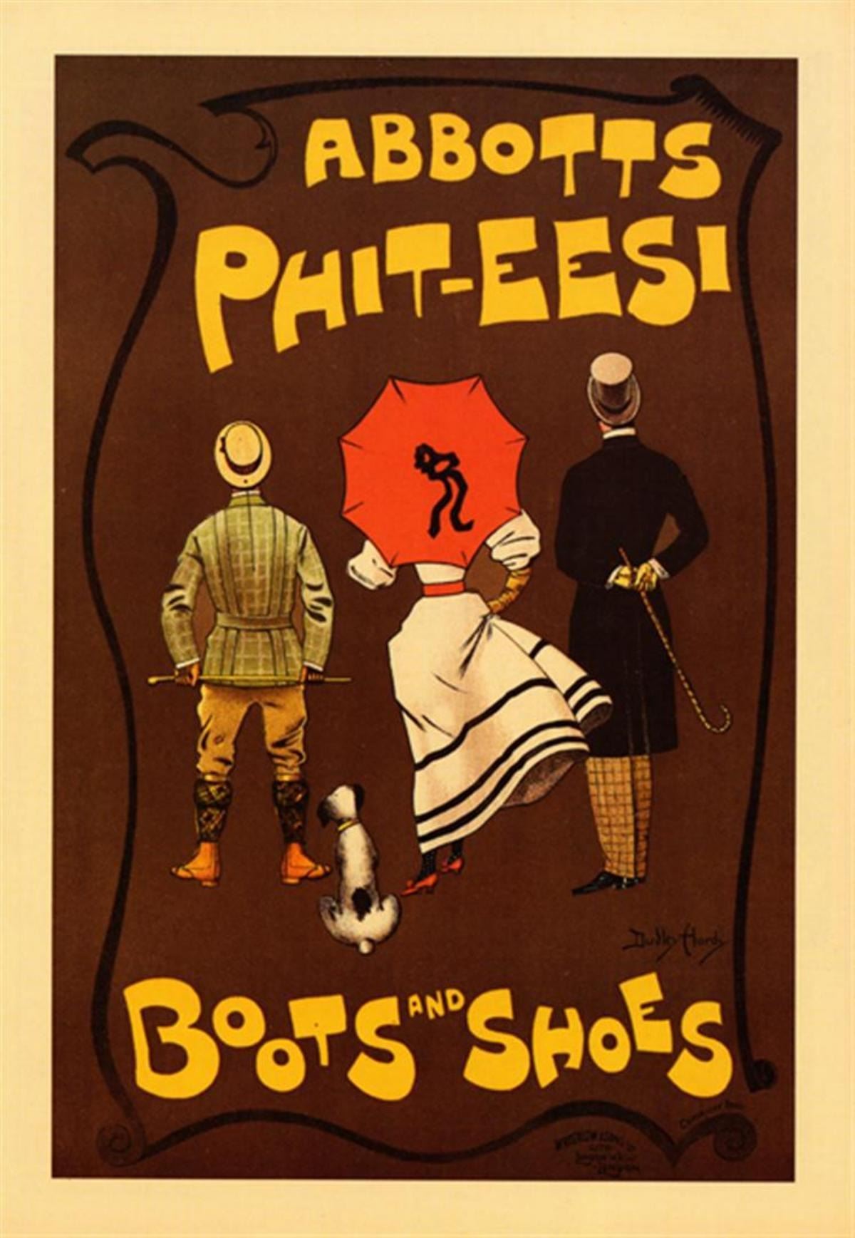 Artist: Dudley Hardy Title: Abbotts Phit-eesi Boots and Shoes Medium: Fine Art Giclee on Canvas Image Size: Approximately 32 inches x 22 inches Framed: Unframed on Unstretched Canvas Details: This is a beautiful Reproduction Giclee on Archival Canvas "The prolific English artist Dudley Hardy is best known for his work for publications and the theatre, both as an illustrator and posterist. His work for commercial firms is considerably rarer. And yet his contribution to poster art is considerable: 'He really introduced the colour poster to England. His posters are strongly derivative of Jules Cheret's. Like Cheret he appreciated the advertising value of sex-appeal, and his recurring subjects are legs, tutu's, frou-frous and legs again.