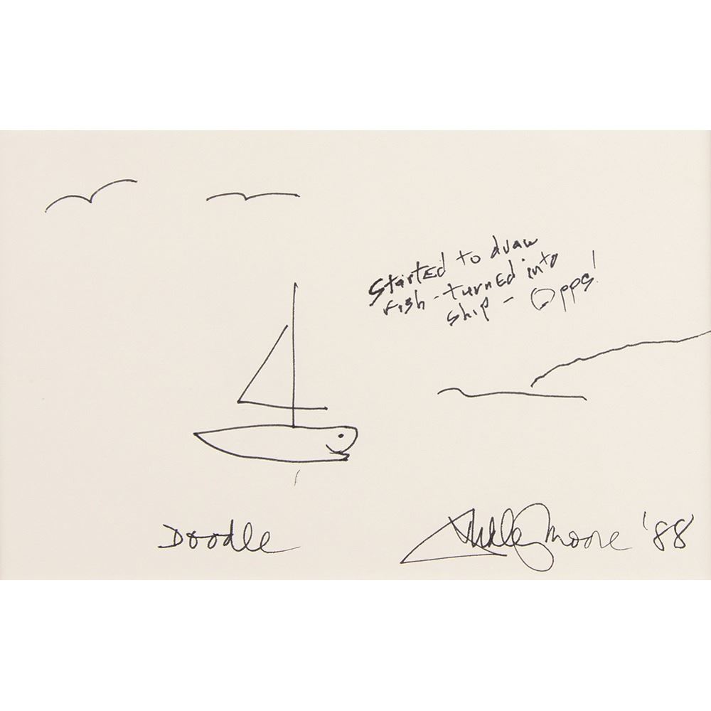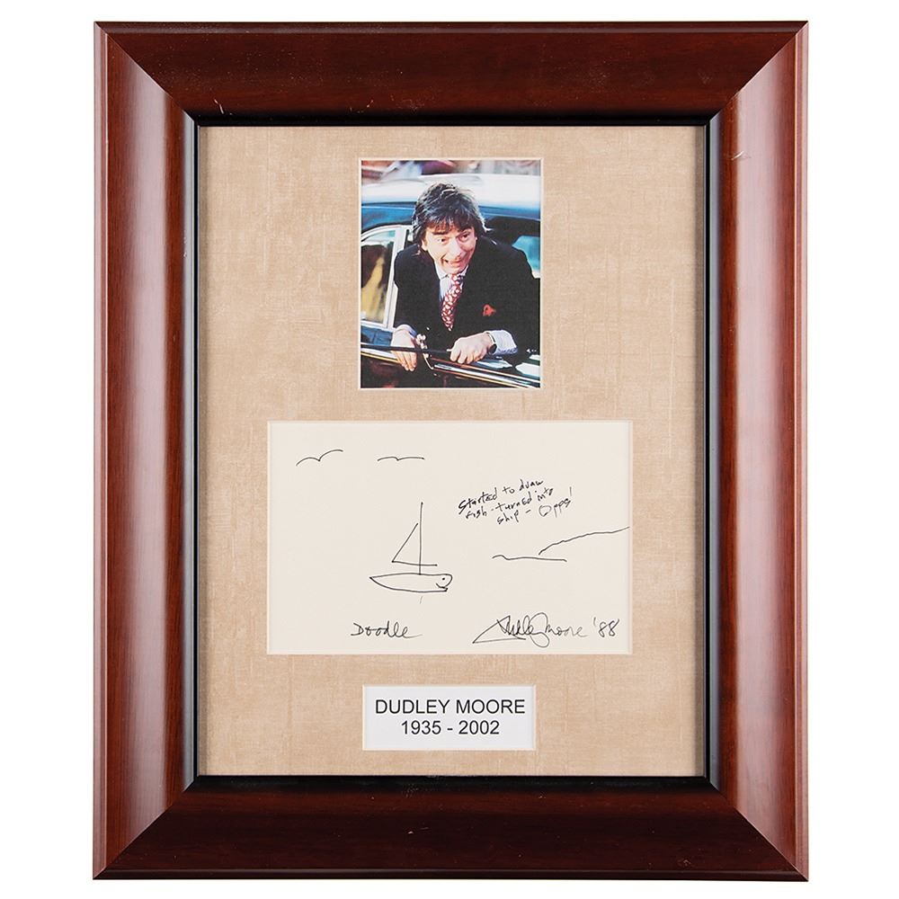 Original ink sketch of a fish-shaped boat accomplished by Moore on an off-white 7.5 x 4.75 sheet, signed in black felt tip, "Started to draw fish—turned into ship—Opps! Dudley Moore '88." Matted and framed with a portrait and caption to an overall size of 15 x 18. In very fine condition.