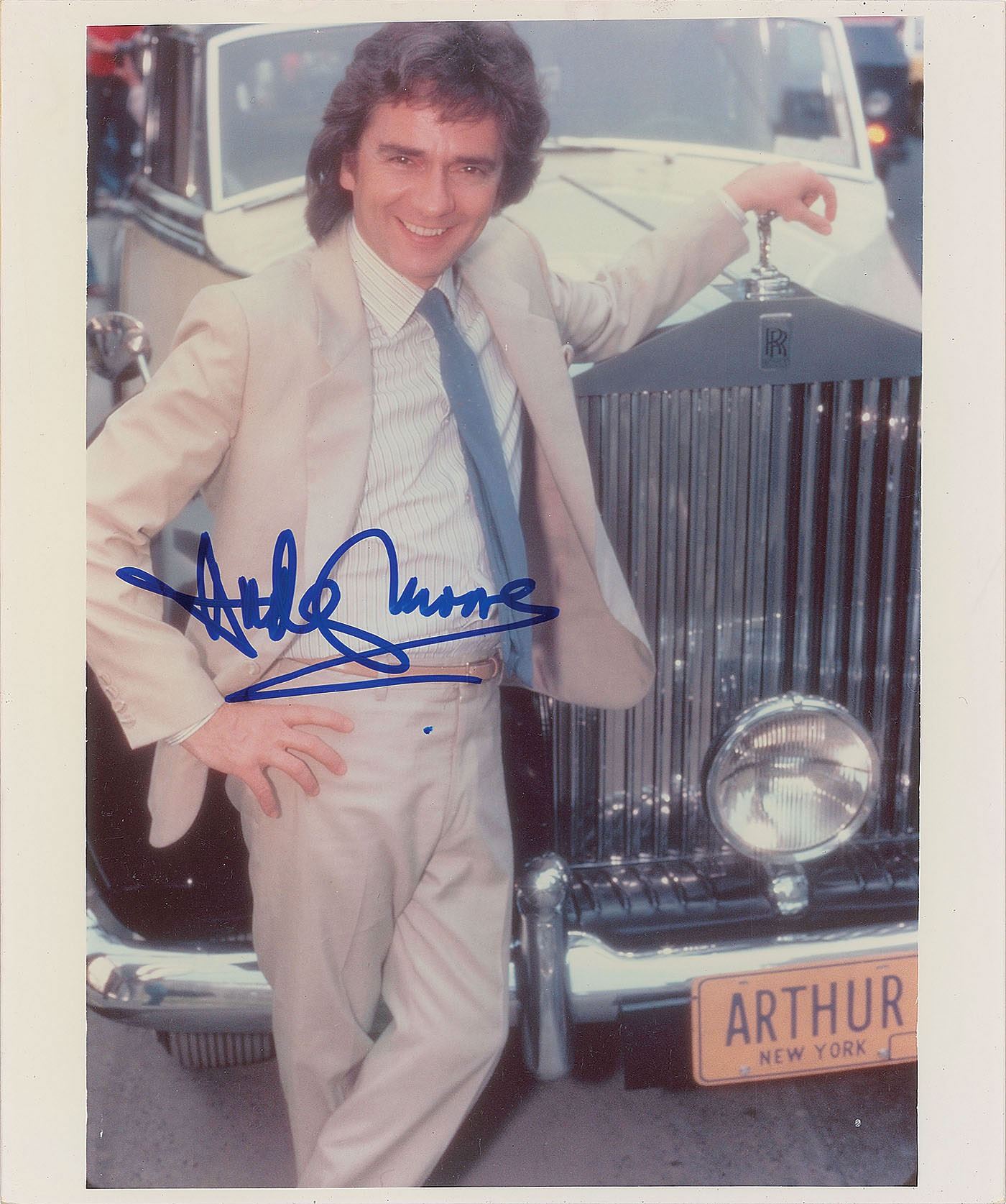 Color glossy 8 x 10 photo of Moore as Arthur Bach posing on a Rolls-Royce Silver Wraith limousine, signed in blue felt tip. In fine condition, with a couple small spots to the emulsion in the top border.