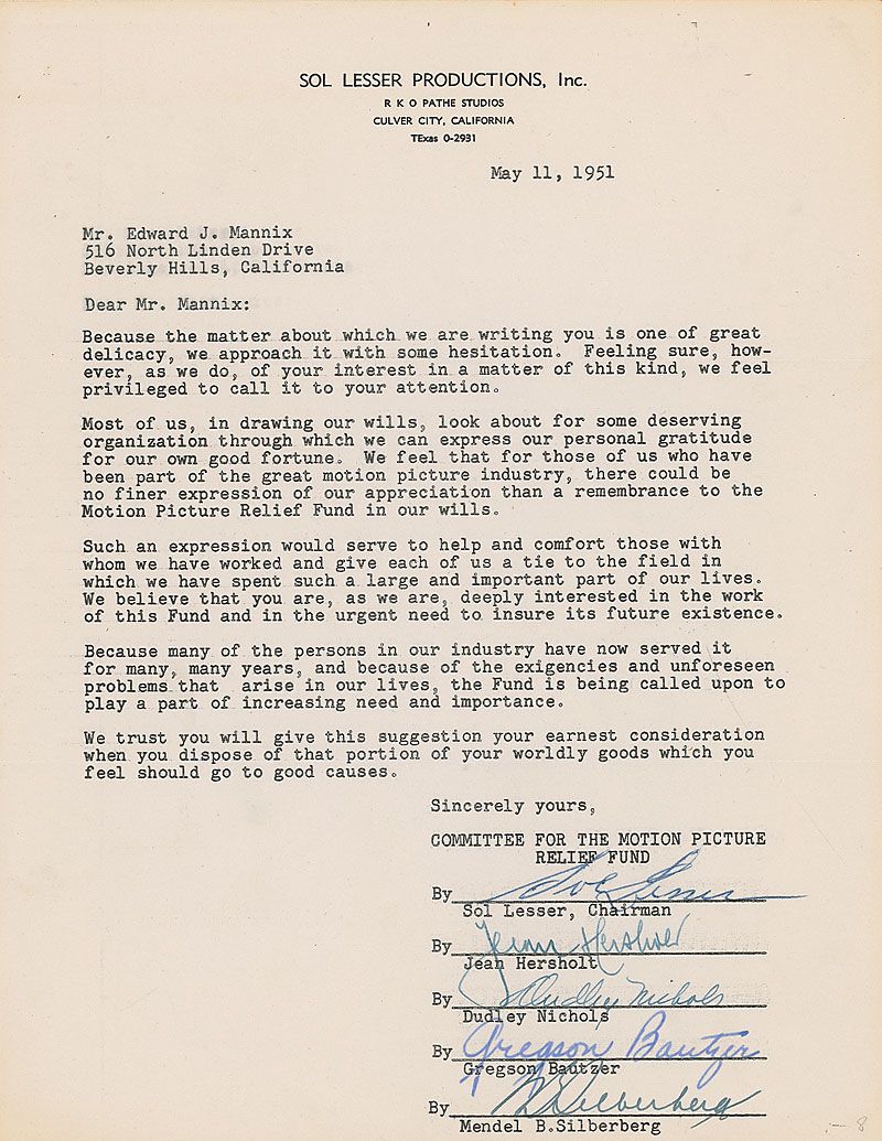 Screenwriter (1895–1960) who came to prominence after winning and refusing the Academy Award for The Informer in 1936. TLS, one page, 8.5 x 11, Sol Lesser Productions letterhead, May 11, 1951. Letter to MGM executive Eddie Mannix. In part: “Most of us, in drawing our wills, look about for some deserving organization through which we can express our personal gratitude for our own good fortune. We feel that for those of us who have been part of the great motion picture industry, there could be no finer expression of our appreciation than a remembrance to the Motion Picture Relief Fund in our wills…We trust you will give this suggestion your earnest consideration.” Signed at the conclusion by Sol Lesser, Jean Hersholt, Dudley Nichols, Gregson Bautzer, and Michael B. Silberberg. In fine condition.