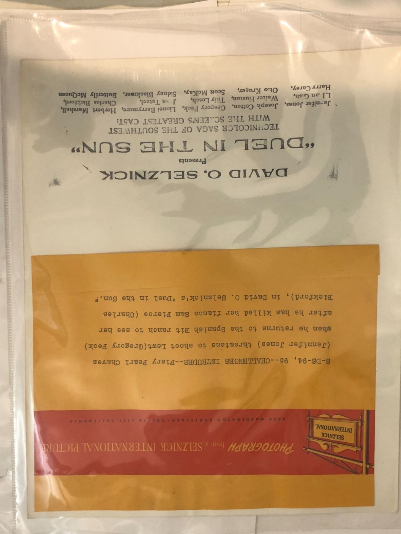 Duel in the Sun photos. Duel in the Sun (nicknamed Lust in the Dust) is a 1946 American psychological Western film directed by King Vidor, produced and written by David O. Selznick, which tells the story of a Mestiza (half-Native American) girl who goes to live with her white relatives, becoming involved in prejudice and forbidden love. The photos include the actors and actresses: Jennifer Jones, Gregory Peck , Walter Huston,