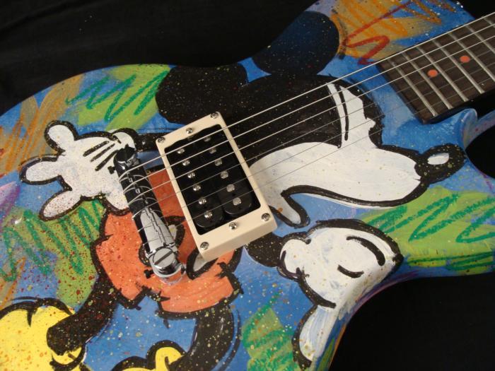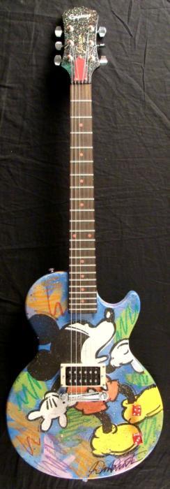 This genuine Epiphone Gibson electric guitar has been turned into a work of animation art, featuring the beloved Mickey and Minnie Mouse! The original art was done by artist Dick Duerrstein, who knows his animation quite well, and has done many original renditions. This piece is certainly something special, and the artist himself has sent it directly to us!