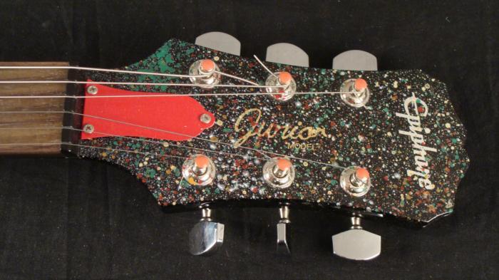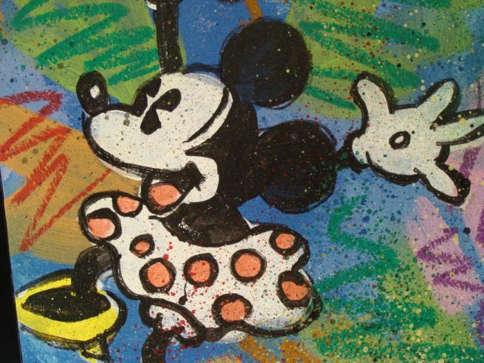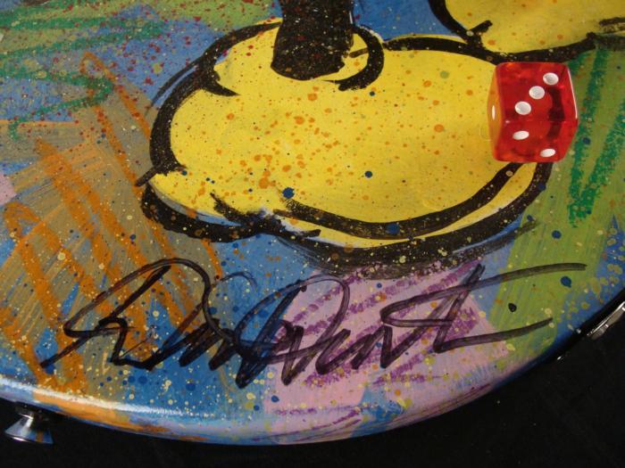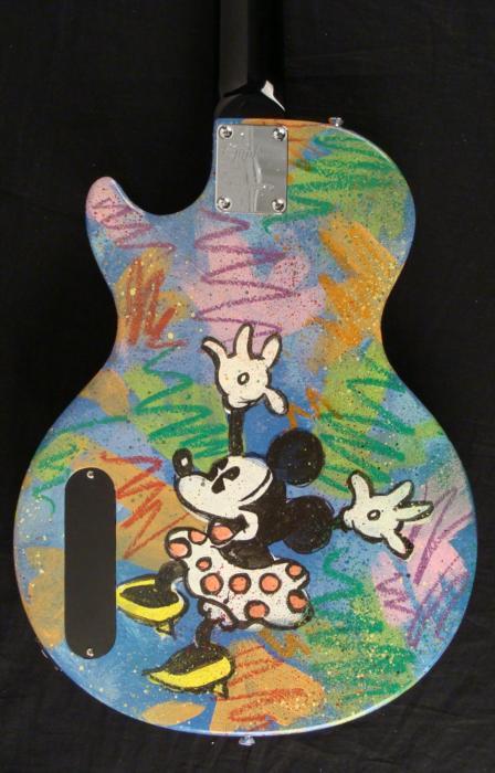 On the front of this guitar is a classic Disney style Mickey, looking upward. Splotches and zig zags of color cover the blue painted background, giving it Pop Art look, reminiscent of Ronnie Cutrone. The back side has Minnie Mouse in her polka dot dress, looking like she's doing the sock hop. Medium: Acrylic paint on guitar Signed by the artist in black marker, lower front Guitar: Ephiphone Junior model Year of guitar: 2008, dated from serial number: SJ08033973 Extras: Dice tuners (could be switched out for regular tuning knobs) Guitar dimensions: 39" long from end to end, 13" wide at the widest, and 1 1/2" thick at the body Condition: New, with owner's manual and cables If you're a Mickey Mouse fan, you'll love this unique orignal guitar. And if you're in a band, you can jam with Mickey and Minnie! Duerrstein's work can be found in the Walt Disney Studio corporate offices, Burbank, California; The Library of Congress, Washington, D.C. and St. Jude's Research Hospital in Memphis, Tennessee and private collections worldwide.