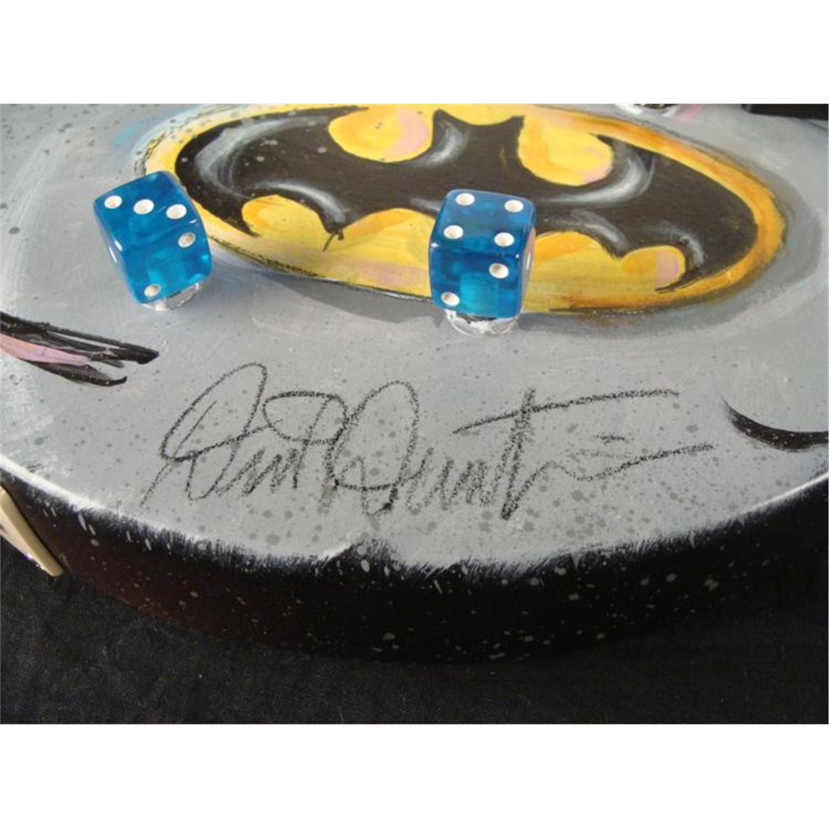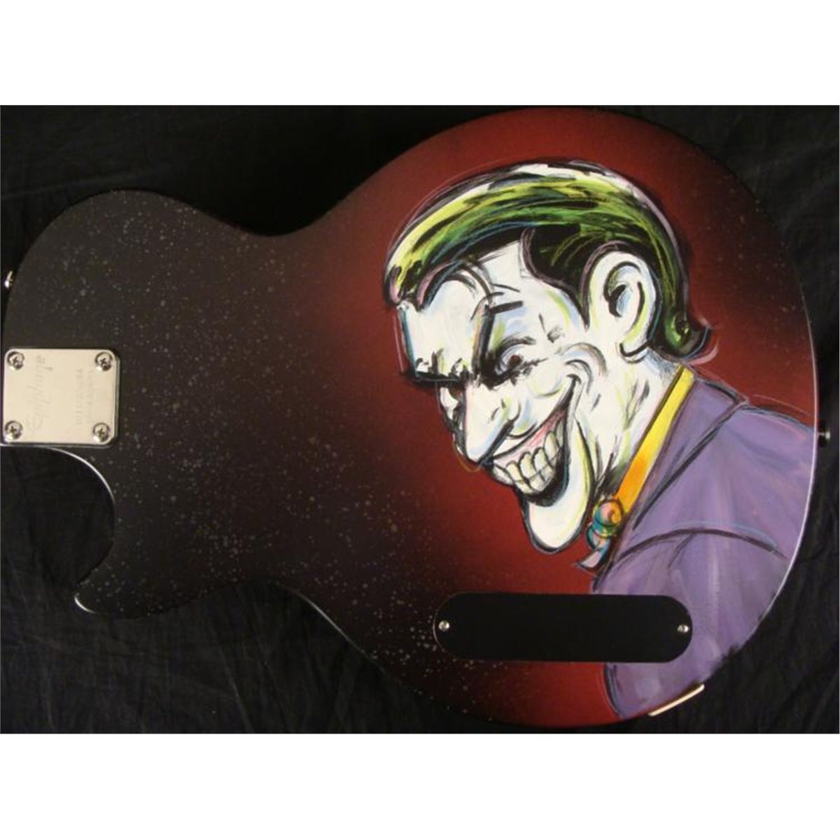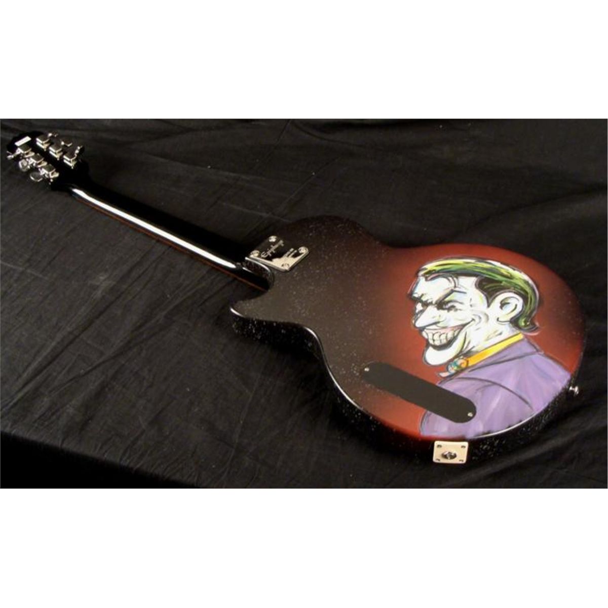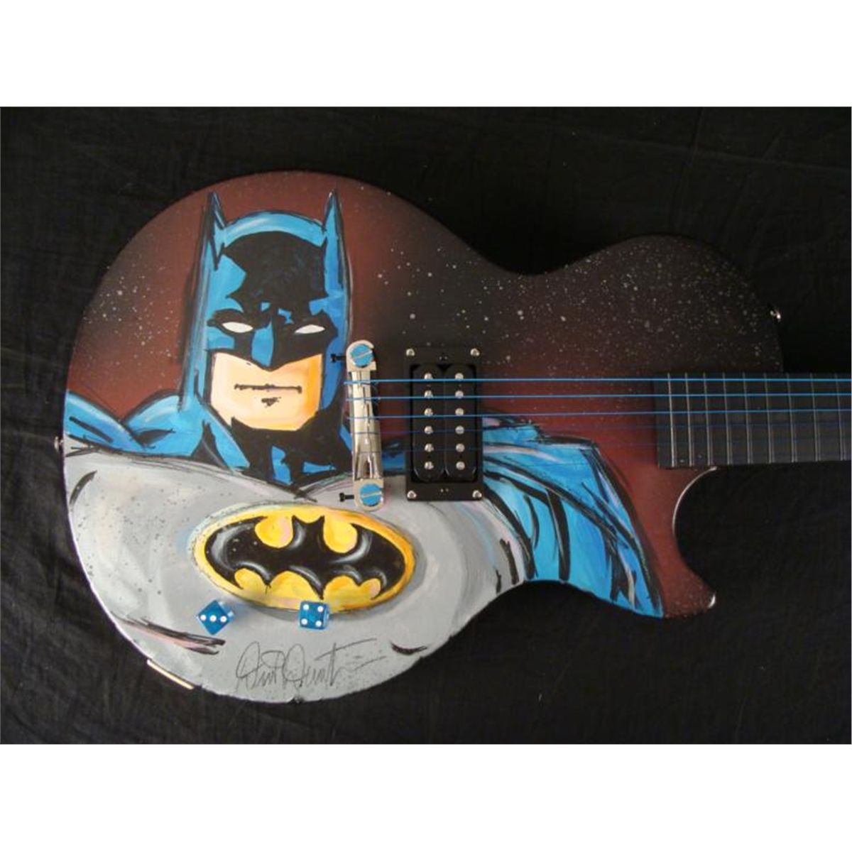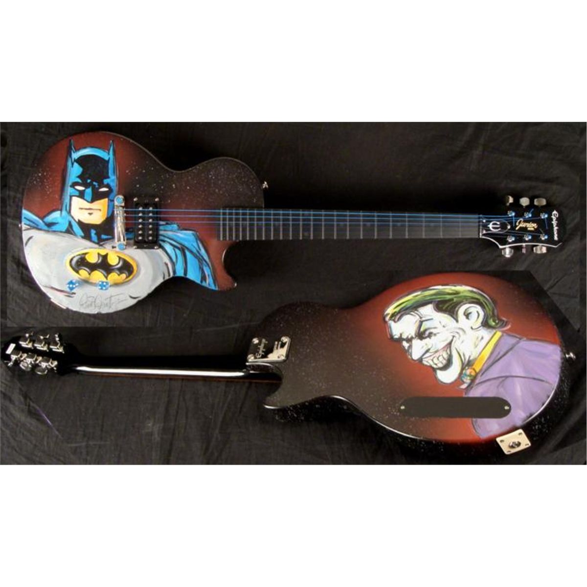 This was once an ordinary Epiphone Gibson electric guitar, but it has been transformed into a dark and heroic instrument. It's a Batman guitar! This one and only original guitar was created by artist Dick Duerrstein, who has super powers of his own in animation art. This guitar is certainly an exciting one, and the artist himself has sent it directly to us! * The classic pose captures the mysterious caped crusader gazing forward, in front of a purple night sky. But watch out--because lurking on the other side is a villiain--the Joker! Just like him to pop up in an unexpected place. This is a fantastic guitar that's got it all! * Medium: Acrylic paint on guitar Signed by the artist on front Guitar: Gibson Ephiphone Junior model Serial number: 10112305084Extras: Blue dice tuners, blue strings Guitar dimensions: 39" long from end to end, 13" wide at the widest, and 1 5/8" thick at the body Condition: Mint, in the original box, with instructions and cords * You're sure to turn heads, whether you have a Batman collection, or a band, with this Batman Guitar! * Duerrstein's art can be found in the Walt Disney Studio corporate offices, Burbank, California; The Library of Congress, Washington, D.C. and St. Jude's Research Hospital in Memphis, Tennessee and private collections worldwide. *