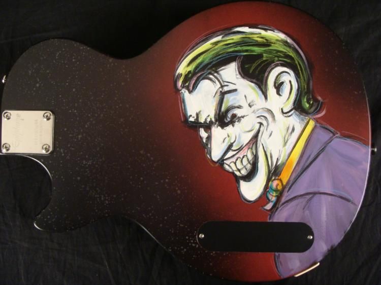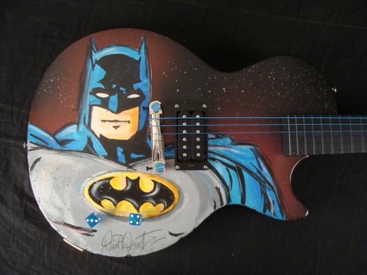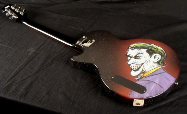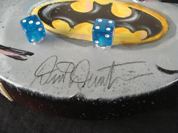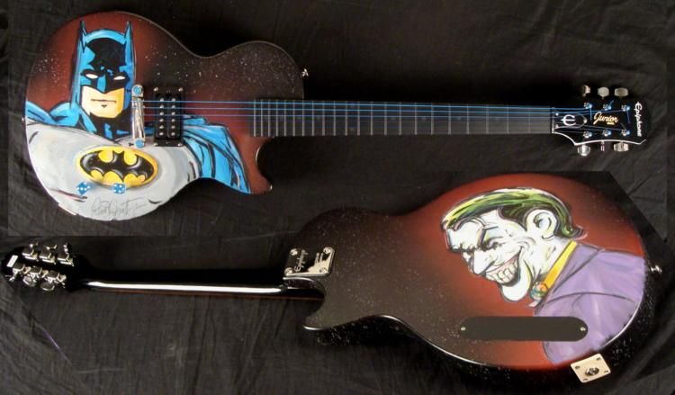 This was once an ordinary Epiphone Gibson electric guitar, but it has been transformed into a dark and heroic instrument. It's a Batman guitar! This one and only original guitar was created by artist Dick Duerrstein, who has super powers of his own in animation art. This guitar is certainly an exciting one, and the artist himself has sent it directly to us! * The classic pose captures the mysterious caped crusader gazing forward, in front of a purple night sky. But watch out--because lurking on the other side is a villiain--the Joker! Just like him to pop up in an unexpected place. This is a fantastic guitar that's got it all! * Medium: Acrylic paint on guitar Signed by the artist on front Guitar: Gibson Ephiphone Junior model Serial number: 10112305084Extras: Blue dice tuners, blue strings Guitar dimensions: 39" long from end to end, 13" wide at the widest, and 1 5/8" thick at the body Condition: Mint, in the original box, with instructions and cords * You're sure to turn heads, whether you have a Batman collection, or a band, with this Batman Guitar! * Duerrstein's art can be found in the Walt Disney Studio corporate offices, Burbank, California; The Library of Congress, Washington, D.C. and St. Jude's Research Hospital in Memphis, Tennessee and private collections worldwide. *