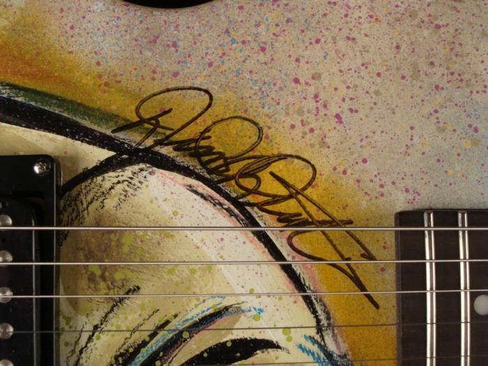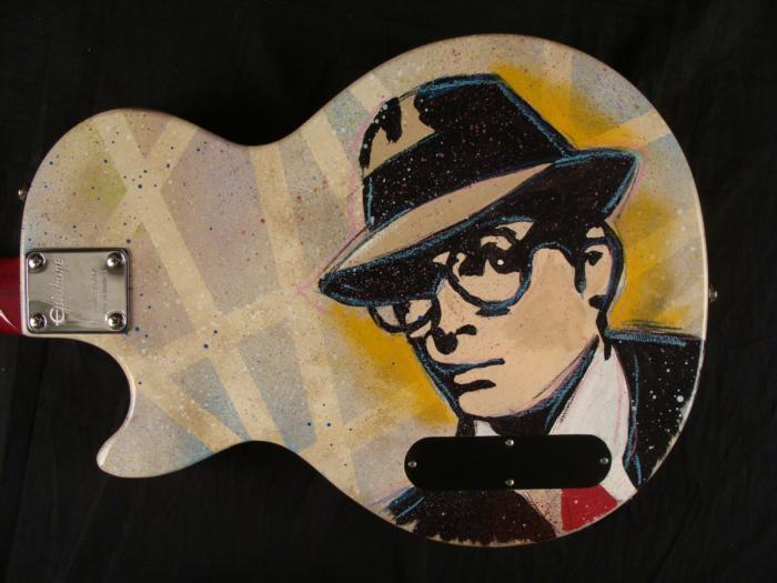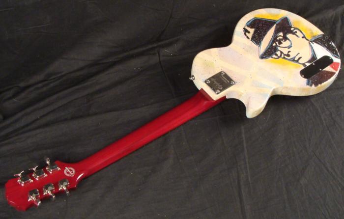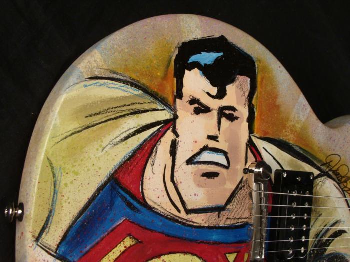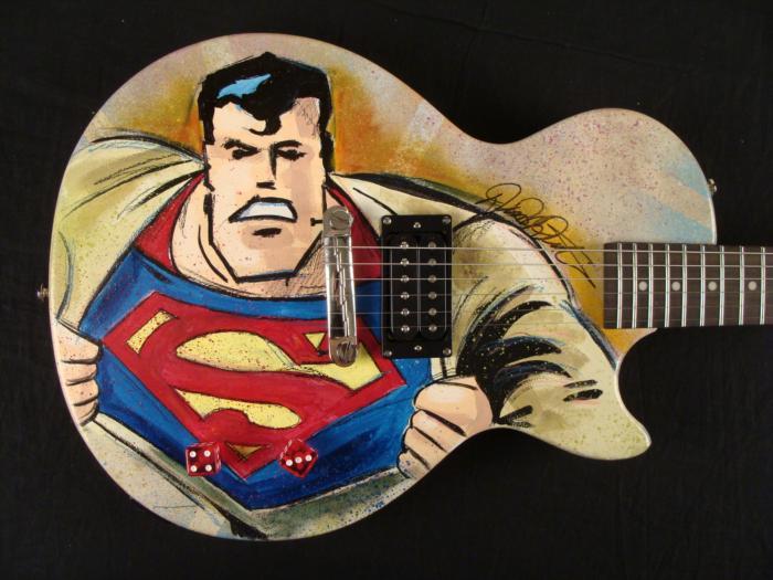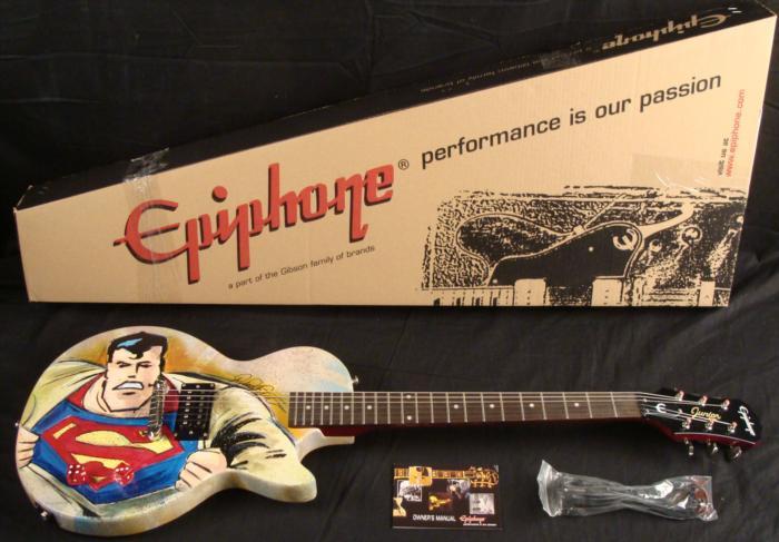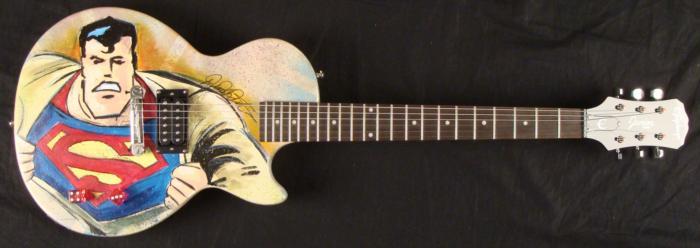 This mild-mannered Epiphone Gibson electric guitar has been transformed into a super-heroic instrument. It's a real guitar, it's hand-painted, it's Superman! This one and only original guitar was created by artist Dick Duerrstein, who has super powers of his own in the field of animation art. This guitar is certainly an exciting one, and the artist himself has sent it directly to us!