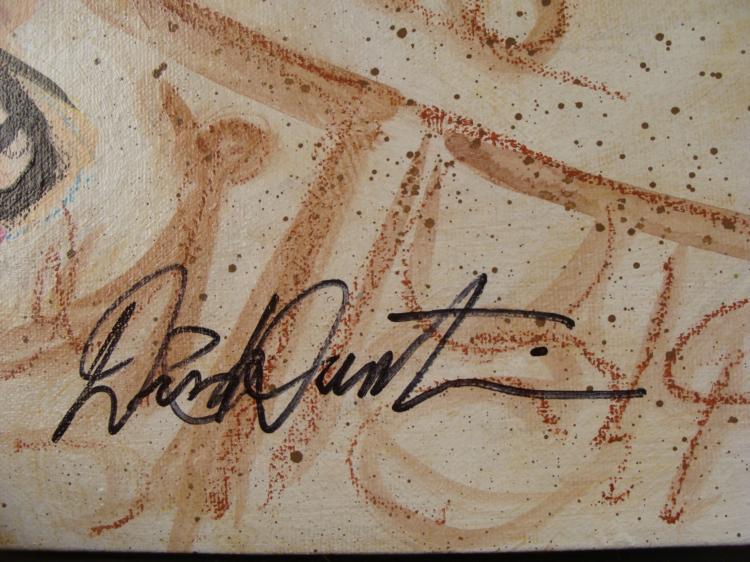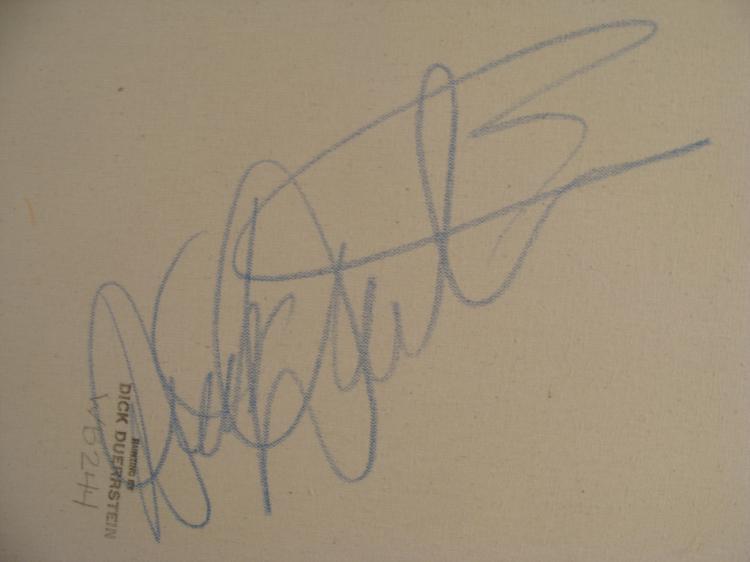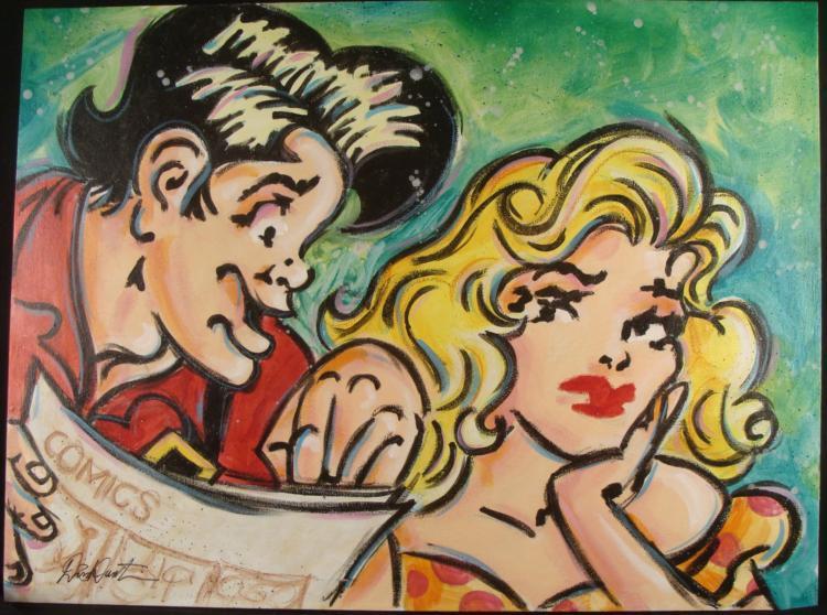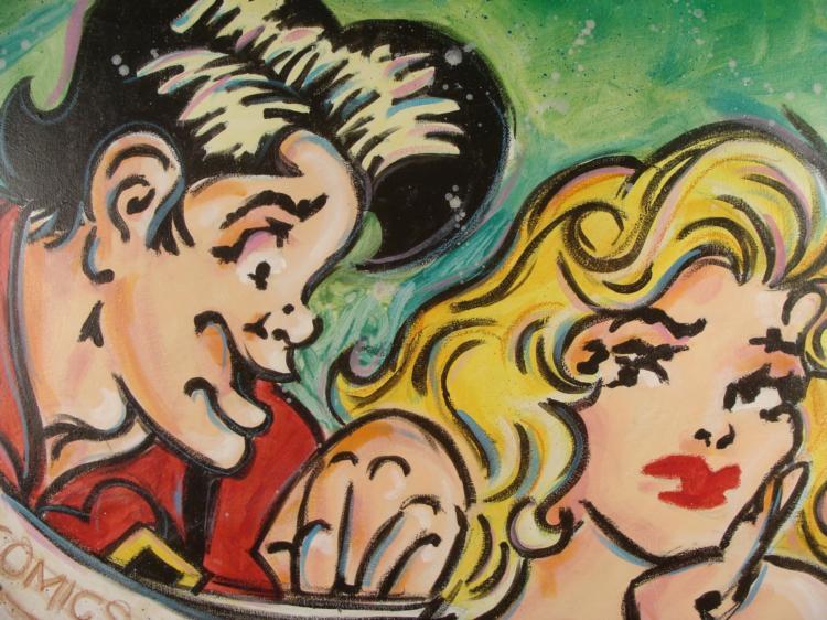 The hillbilly town of Dogpatch USA has been declared the "most unnecessary town" in the U.S. and is set to be turned into a nuclear testing site. At the same time, the baby tonic (Yokumberry Tonic) that Li'l Abner has been fed all his life by his mother, Mammy Yokum, is discovered to be a potion that makes men strong and handsome, but also utterly uninterested in romance. But that fact does not deter Daisy Mae, who is determined to win the handsome--but uninterested--Li'l Abner at the Sadie Hawkins Day race. Appassionata von Climax also has her sights set on Li'l Abner, but Daisy has hired the beautiful Stupefyin' Jones to help her win the race, while von Climax brings in Evil Eye Fleagle to distract the men. The men, meanwhile, take part in an experiment that makes them all good-looking but not interested in women * * Artist: Dick Duerrstein Title: "Check Out These Comics" Medium: Acrylic paint on stretched canvas Signature: Signed by the artist, lower lower left, and on the verso Markings: Artist name stamped on verso, and on the frame Dimensions: 30" x 40" Condition: Mint Certificate of Authenticity: Provided by Midwest Estate Buyers You can have a wonderful time in Dogwatch with Daisy Mae and Little Abner! * Duerrstein's work can be found in the Walt Disney Studio corporate offices, Burbank, California; The Library of Congress, Washington, D.C. and St. Jude's Research Hospital in Memphis, Tennessee and private collections worldwide. *