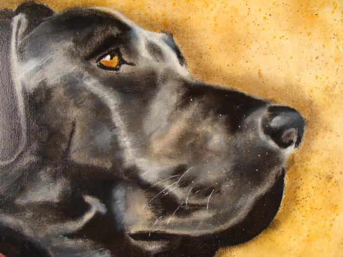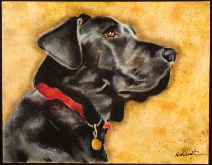 Here is a very handsome Black Lab in this nicely done original painting. The natural tone tan background gives the feeling of being outdoors where this dog is truly happy. The artist is known for his animation art, but he also knows his dogs quite well too. Artist: Dick Duerrstein Medium: Acrylic paint on stretched canvasSigned by the artist, lower left, and on the verso Other markings: Artist's name stamped on verso Size: 22" x 28" Condition: Mint- straight from the artist to usYou'll be proud to have this black lab painting in your home. Duerrstein's work can be found in the Walt Disney Studio corporate offices, Burbank, California; The Library of Congress, Washington, D.C. and St. Jude's Research Hospital in Memphis, Tennessee and private collections worldwide.