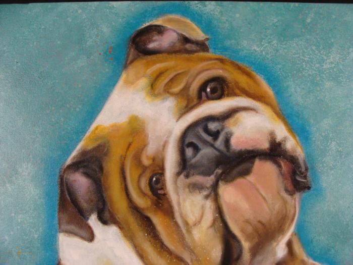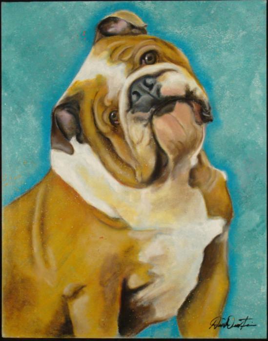This English bulldog has its head cocked to the side in an inquisitive and friendly way. Bulldog owners know the beauty of this breed, and this original painting captures it perfectly. The artist is known for his animation art, but he also knows his dogs quite well too. Artist: Dick Duerrstein Medium: Acrylic paint on stretched canvasSigned by the artist, lower left, and on the verso Other markings: Artist's name stamped on verso Size: 22" x 28" Condition: Mint- straight from the artist to usThis bulldog is full of character, and you'll love having this fine original painting. Duerrstein's work can be found in the Walt Disney Studio corporate offices, Burbank, California; The Library of Congress, Washington, D.C. and St. Jude's Research Hospital in Memphis, Tennessee and private collections worldwide.