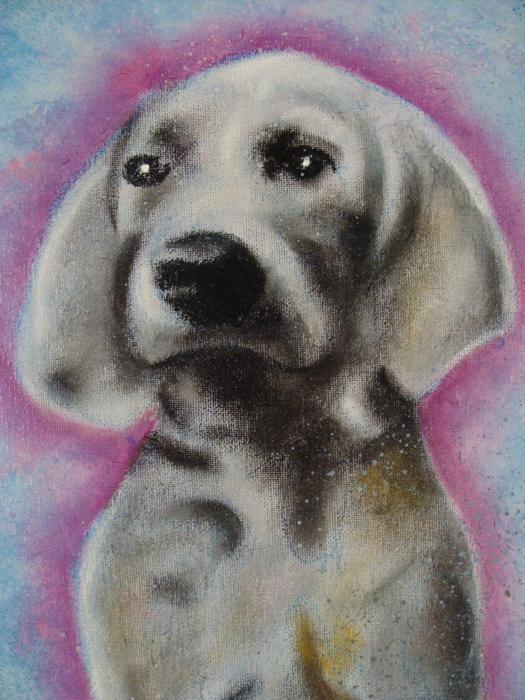 Here is an adorable young labrador retriever in this wonderful original painting. The glowing outline conveys the bright spirit of this loyal dog. The artist is known for his animation art, but he also knows his dogs quite well too. Artist: Dick Duerrstein Medium: Acrylic paint on stretched canvasSigned by the artist, lower left, and on the verso Other markings: Artist's name stamped on verso Size: 18" x 24" Condition: Mint- straight from the artist to usThis original dog painting will look very appealing in your home.