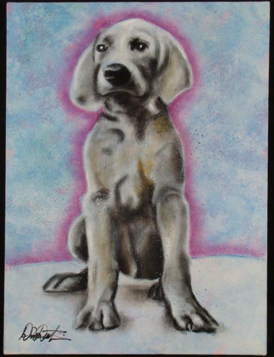 Here is an adorable young labrador retriever in this wonderful original painting. The glowing outline conveys the bright spirit of this loyal dog. The artist is known for his animation art, but he also knows his dogs quite well too. * Artist: Dick Duerrstein Medium: Acrylic paint on stretched canvas Signed by the artist, lower left, and on the verso Other markings: Artist's name stamped on verso Size: 18" x 24" Condition: Mint- straight from the artist to us This original dog painting will look very appealing in your home. * * Duerrstein's work can be found in the Walt Disney Studio corporate offices, Burbank, California; The Library of Congress, Washington, D.C. and St. Jude's Research Hospital in Memphis, Tennessee and private collections worldwide. *