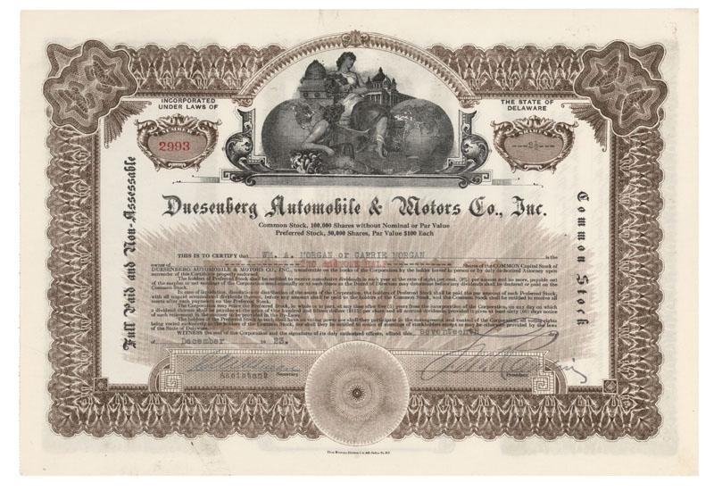 1923, Delaware. Stock certificate for 2.5 shares. Brown/Black. Vignette of a seated allegorical man and woman between two globes at the top center. Litho. Uncancelled and in extremely fine condition overall. Fred Duesenberg (1876-1932) had been well known as a designer of fast, powerful, reliable gasoline engines which came to be widely used in the marine, automotive and aviation industries. From 1903-1913 Duesenberg was the chief engineer of the Mason Motor Car Company. In 1913, Fred and his brother August (1878-1955) established the Duesenberg Motor Company to manufacture gasoline engines of their own design. Success was immediate, with Mulford and Rickenbacker consistently driving Duesenberg-powered racers to commanding victories. In 1920, the brothers began building their first production car, the Model A. While the car created a sensation at its debut, it was a mere shadow of the massive and extraordinarily expensive Model J (and later SJ and SSJ) which was introduced in 1928. Of the Duesenberg marque it has been said, "If but one of all the automobiles ever built in America had to be singled out as the most glorious achievement in this country's automotive history, that car would have to be the Duesenberg. It transcended the ordinary in full measure, created legends in its wake which will live forever, and bacame a literal metaphor--'It's a Duesy'--for anything unrelentingly superlative."