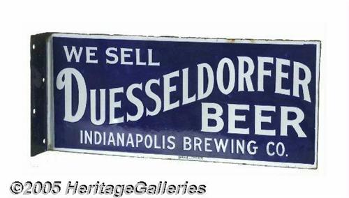 <B>Duesseldorfer Beer, Indianapolis Brewing Co. Sign</B></I> Made of porcelain by OHayle -- Chicago, near mint condition, this rare, two sided, flange brew sign has very minor edge roughness as one might expect. Nice blue and white color with wording on both sides, and most probably made when the company was renamed Indianapolis Brewing in 1935 just after prohibition. Duesseldorfer had been a standard beer brewed by Indianapolis since it was formed in 1887 by combining the Casper Maus, P. Lieber, and C. F. Schmidt Brewing companies. Made to be mounted to stick out from a wall, the sign measures 16" by 7". Lot:252