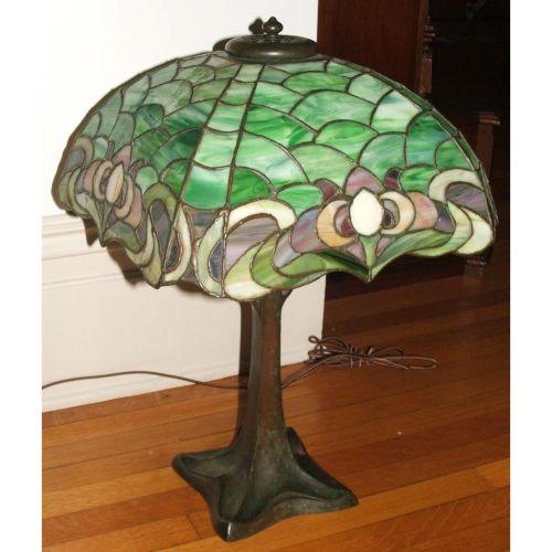 Duffner & Kimberly Owl Lamp. Circa 1905-1913. A nice table lamp with a sea green mottled leaded glass shade with a lavender owl head design. Mounted on a bronze base with a mottle green-brown patina. 22" high X 15 long shade.