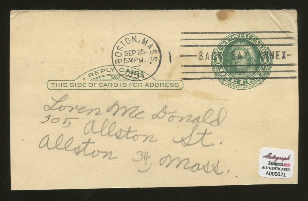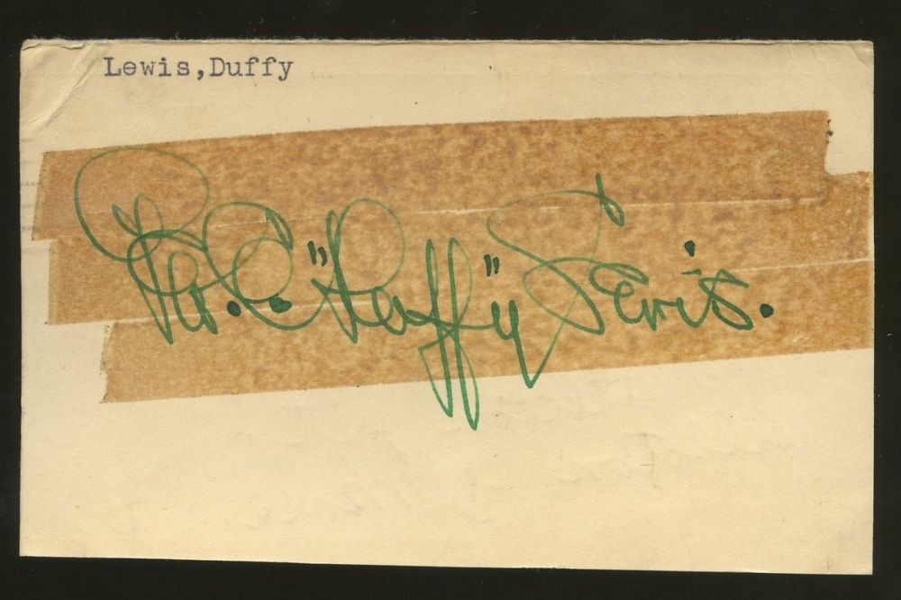 Vintage 3x5 index card hand-signed in green felt tip pen by George Edwards "Duffy" Lewis (D 1979). Lewis was a left fielder and right-handed batter who played for the Boston Red Sox (1910–17), New York Yankees (1919–20) and Washington Senators (1921). He was a 3x World Series Chmapion. Autograph includes an official Autograph Reference (AR) COA for authenticity purposes.