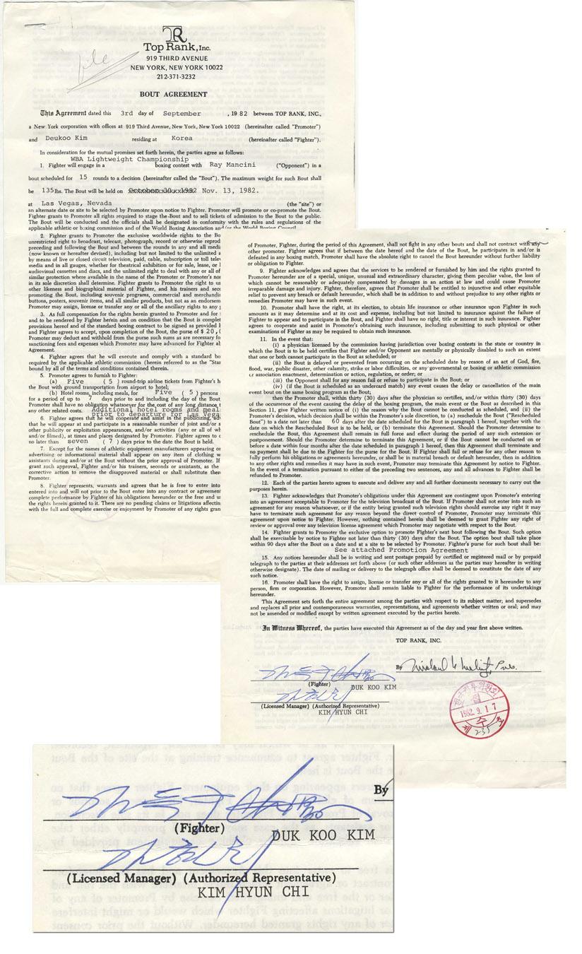 ''Top Rank'' bout agreement signed by Duk-Koo Kim, dated 3 September 1982. The highly anticipated Lightweight Championship match between Ray ''Boom-Boom'' Mancini and South Korean Duk-Koo Kim took place 13 November 1982 at Caesars Palace in Las Vegas. After losing the match, Kim suffered brain injuries that led to his death five days later. Highly-detailed contract discusses the broadcasting and promotional rights to the bout as well as compensation: ''…Fighter will engage in a boxing contest with Ray Mancini ('Opponent') in a bout scheduled for 15 rounds to a decision (hereinafter called the 'Bout'). The maximum weight for such Bout shall be 135lbs. The Bout will be held on Nov. 13, 1982. Promoter agrees to pay to Fighter, and Fighter agrees to accept, upon completion of the Bout, the purse of $20,000 net…'' Contract on two pages, front and verso, measures 8.5'' x 14'' with signature in Korean characters on verso. Countersigned by Kim's manager and Top Rank's then-President Michael Malitz. Additionally includes a red stamp with Korean characters presumably officiating the document. Staple still intact at top left, some creasing to corners and minor folds throughout. Someone has written the word ''file'' in pencil across top of document. Very good condition.