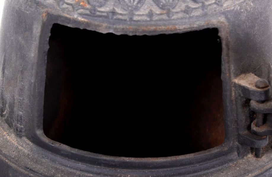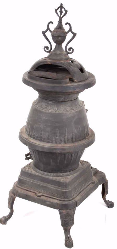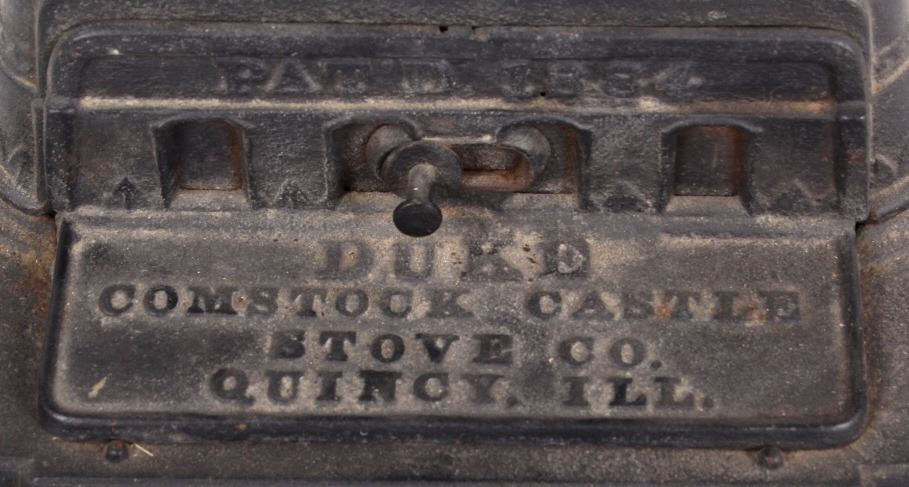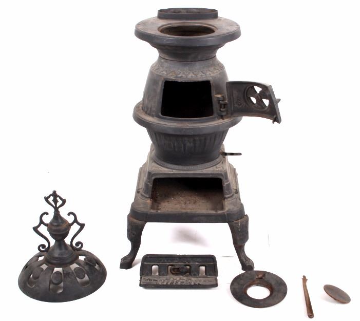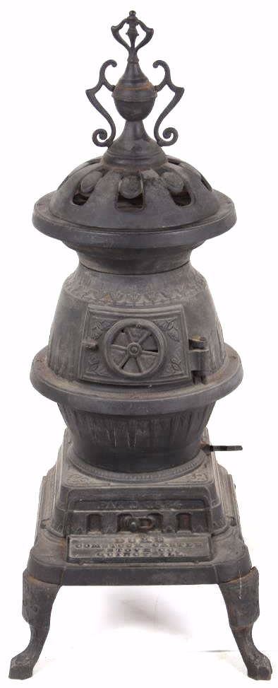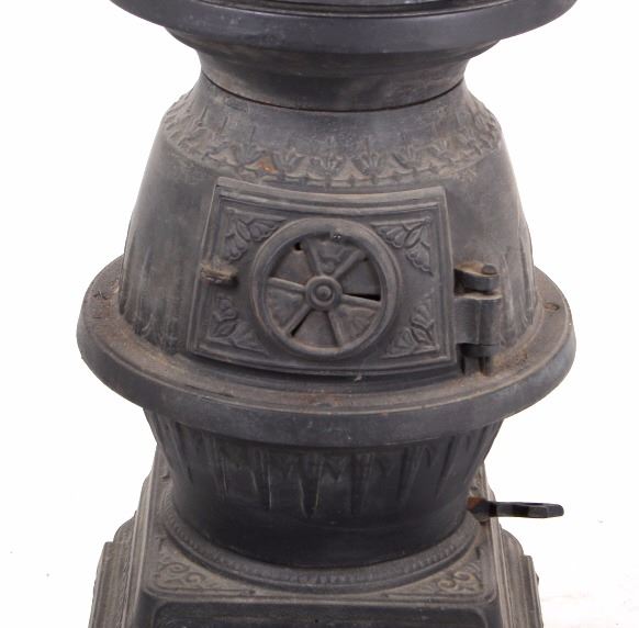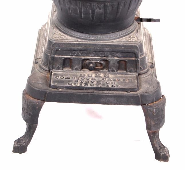 This lot features a Duke Comstock Castle junior sized pot belly stove. This cast iron stoves size makes it a wonderfully versatile piece. It has many subtle decoration and that accent it nicely. This is a complete working piece. This piece is in good condition, but it does show use. It measures 33" H x 11" W x 13 3/4" D