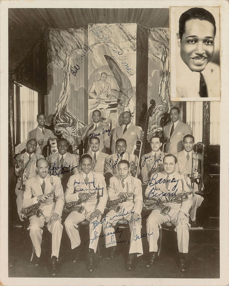 Vintage glossy 8 x 9.75 photo of the Duke Ellington Orchestra, signed and inscribed in fountain pen by ten musicians, “Best wishes to Barbra, Sincerely, Sonny Greer,” “Bill Bailey,” “Richard Jones,” “Fred Guy,” “Fred Jenkins,” “Cootie Williams,” “Harry Carney,” “Joe Morton,” “Juan Tizol,” and “Barney Bigard.” Upper right corner bears an affixed image of Ellington, and the reverse bears Mills Artists Bureau stamps. In fine condition.