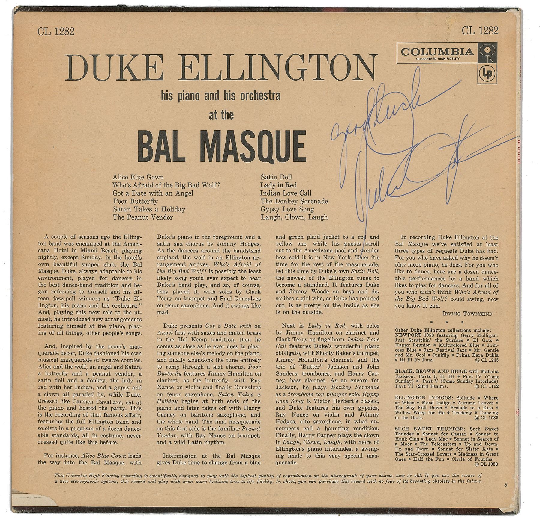 Duke Ellington at the Bal Masque album signed on the back cover in blue ballpoint, "Good Luck, Duke Ellington." In fine condition. The record is included.