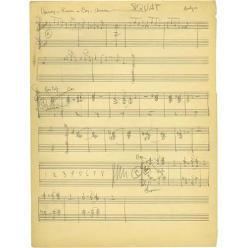<B>Duke Ellington "Squat (Squatty Roo)" Handwritten Score.</B></I> For the true Jazz fan, few vintage documents would make a more spectacular showpiece than a handwritten Duke Ellington chart. "Squatty Roo," a tune originally composed by key Ellington band member Johnny "Rabbit" Hodges, features notes regarding the passages to be played by Ellington band members Harry Carney (baritone saxophone) and Lawrence Brown (trombone). Most of Ellington's scores are housed in the Smithsonian Institution in Washington D.C., and this is one of the last to be made available to the public. <I>Accompanied by a letter of authenticity from Ellington archivist J. Bradley Shigeta.</B></I><BR><BR><b>Shipping:</b> Other (oversized items, group lo (<a target="_blank" href="http://www.heritageauctions.com/common/shipping.php">view shipping information</a>)