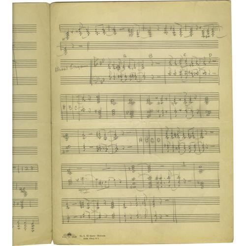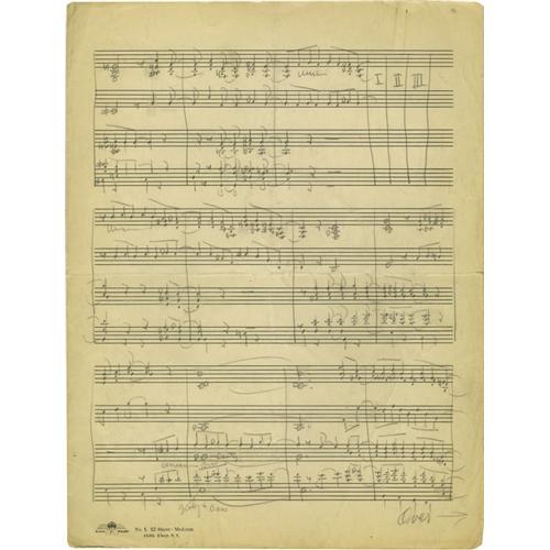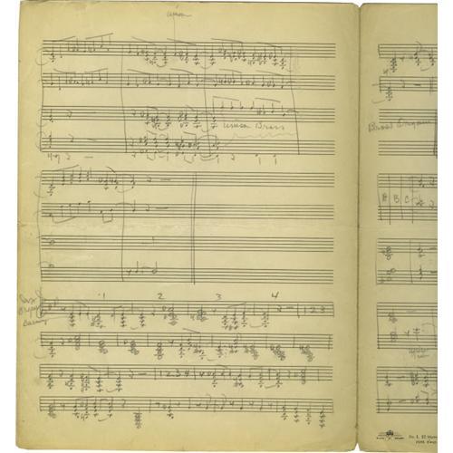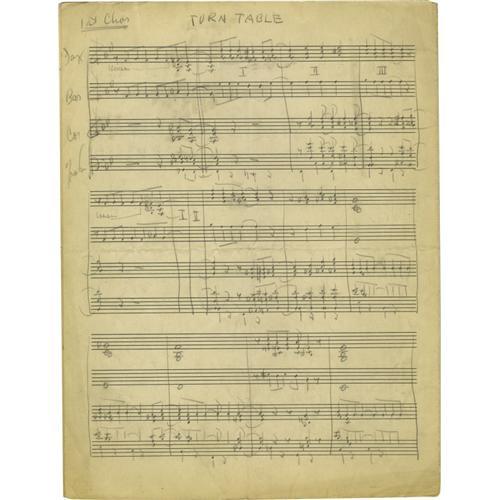 <B>Duke Ellington - "You Turned the Tables On Me," 4-page Hand Written Score (undated).</B></I> Duke Ellington wrote and arranged his songs, and tailored them for the specific talents of his band members rather than for an anonymous horn section. In this score for "You Turned the Table on Me," baritone saxophone player Harry Carney's name is noted next to a portion of the saxophone part. Not content to perform his pieces the same way every outing, Ellington often reworked his charts to keep them fresh. As a result, the performances never grew stale, and they sounded different in the thirties than they did in the fifties, or the sixties. This score is written on the front and back of a double-paged sheet of score paper. Four lines outline the parts for sax, baritone sax, coronet, and trombone. Swingin'! This lot also includes a letter of provenance from a former librarian of the Duke Ellington Orchestra.