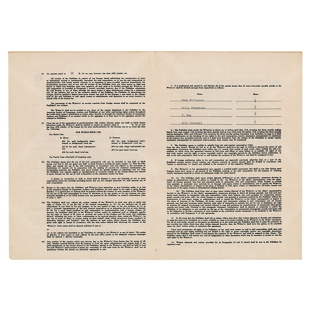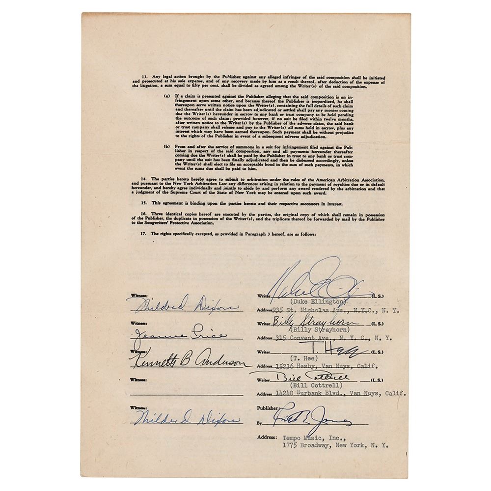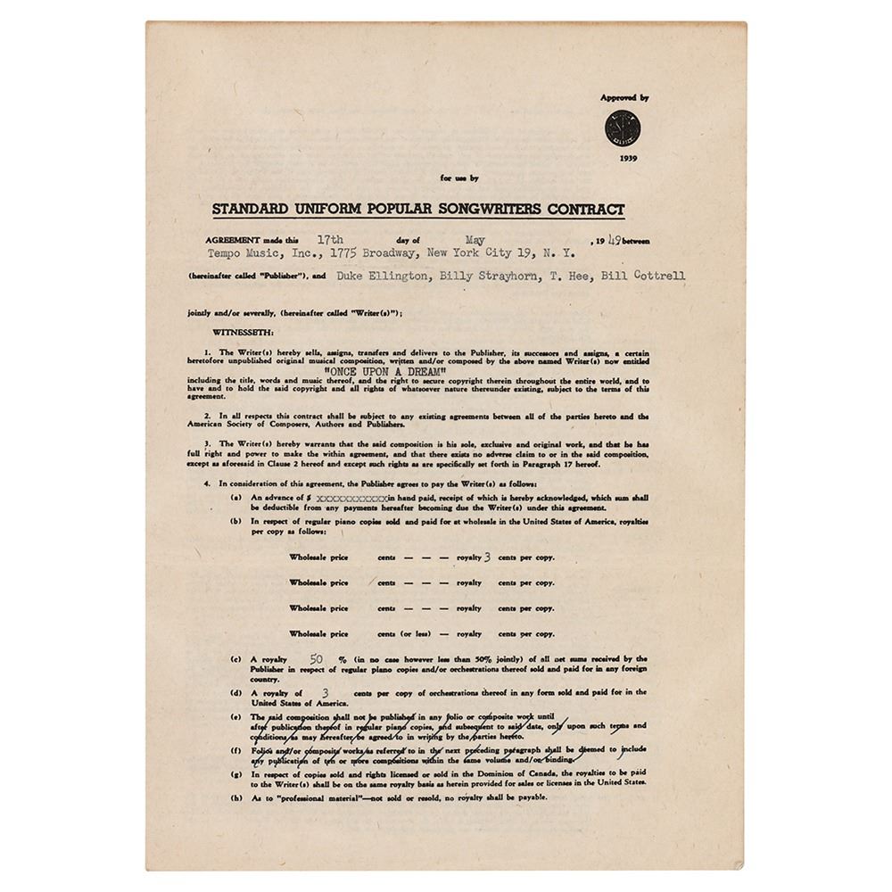 DS, four pages on two adjoining sheets, 7.75 x 11, May 17, 1949. A Standard Uniform Popular Songwriters Contract between Tempo Music and Duke Ellington, Billy Strayhorn, T. Hee, and Bill Cottrell, with the latter group selling, assigning, and transferring all rights to the song ‘Once Upon a Dream.’ Signed at the conclusion ink by Ellington, Strayhorn, Hee, and Cottrell. In fine condition.