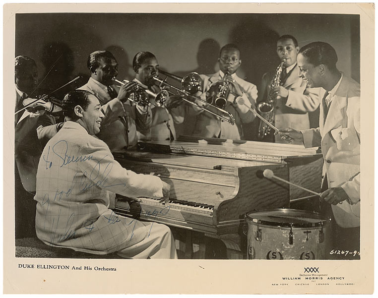 Vintage glossy 10 x 8 publicity photo of Ellington and his orchestra, signed and inscribed in fountain pen “To Sammy, good luck, Duke & the Gang.” In very good condition, with scattered noticeable creases, mild contrast to the light, but legible signature, and mounting remnants to reverse.