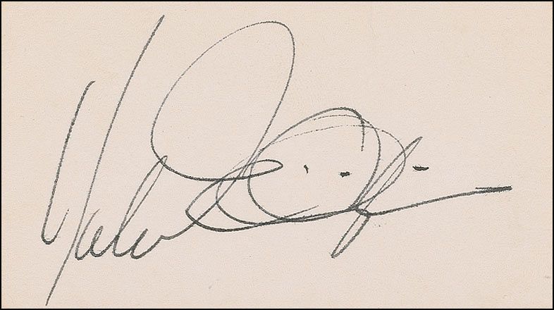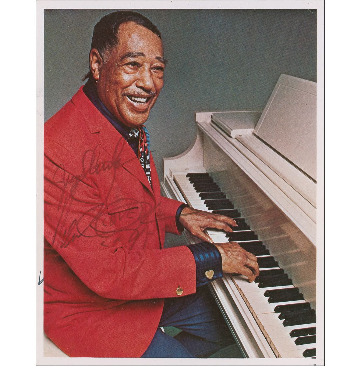 Two items: color cardstock 8 x 10 of Ellington at his piano, signed in black felt tip, “Good Luck, Duke Ellington,” adding the word “Love”; and an ink signature on an off-white 3.5 x 2 card. In fine condition, with irregularly ink adhesion and some light brushing to the signature on the photo.