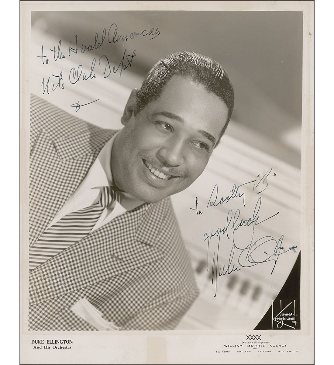 Vintage glossy 8 x 10 publicity photo, signed and inscribed in fountain pen “To the Herald American Nite Club Dept, to Scotty ‘B’ good luck, Duke Ellington.” Toning to borders, tape to edges of reverse, tape to top right corner, and a few scattered light creases and surface marks, otherwise fine condition.