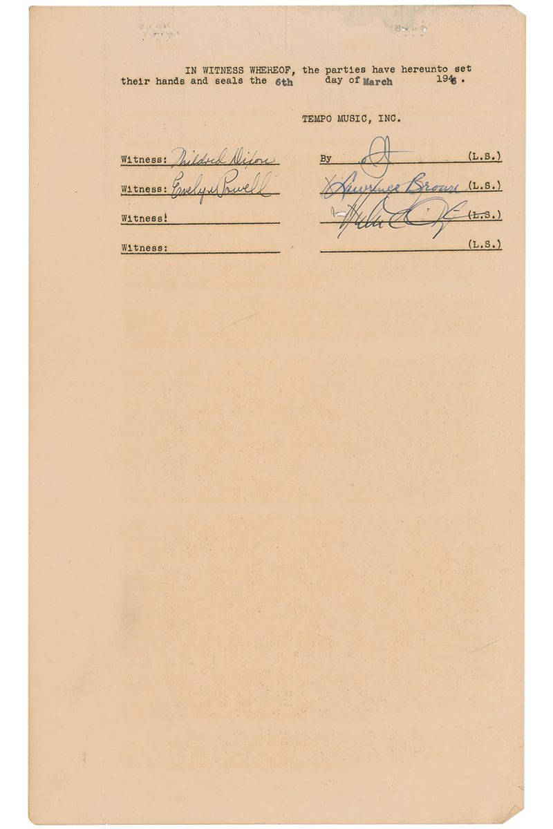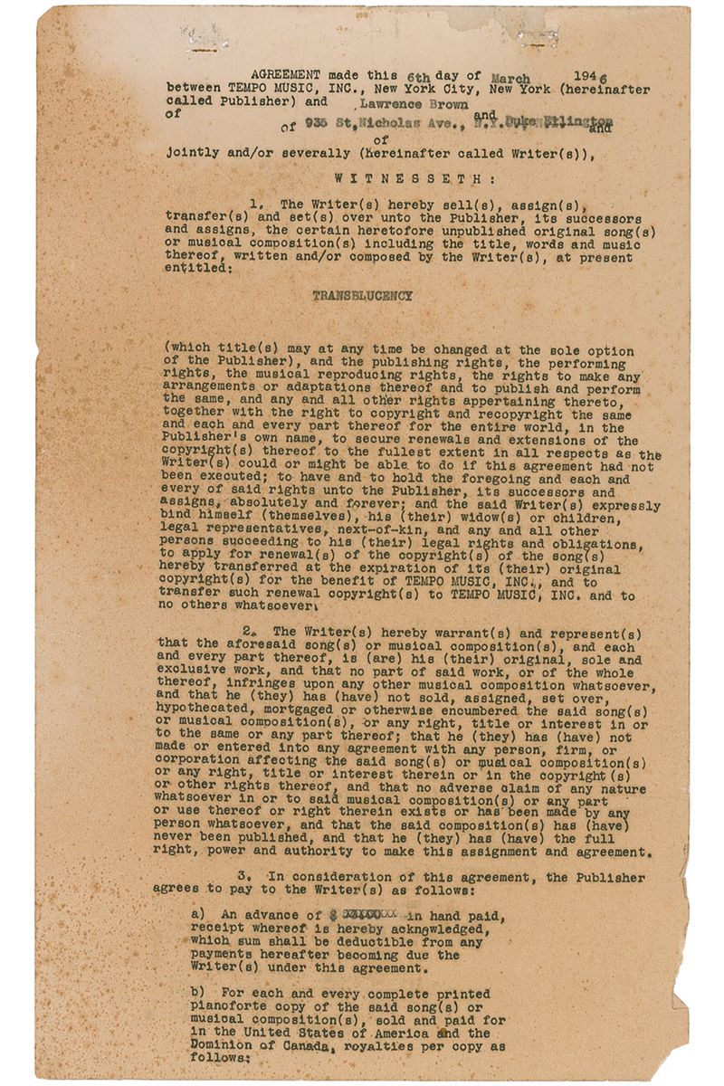 Mimeographed DS, signed in ink by Ellington, four pages, 8.5 x 14, March 6, 1946. Agreement between Lawrence Brown and Ellington’s company Tempo Music, with Tempo agreeing to publish the song ‘Transblucency’ with Brown and Ellington sharing receiving 50% of the royalties. Signed on the last page by Ellington and Brown, and also signed by Daniel James, “DJ.” Uniform toning to all pages, scattered foxing, primarily to first two pages, and torn staple holes to top edges, otherwise very good condition.