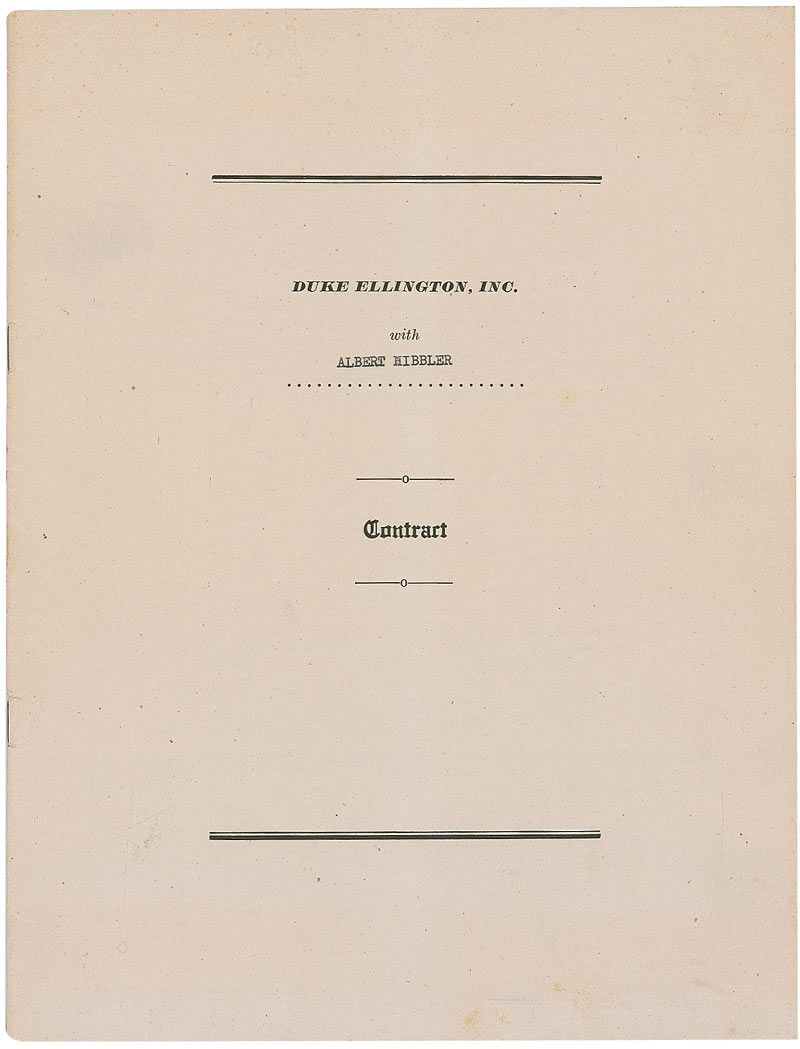 DS, 12 pages, 8.5 x 11, August 29, 1946. Exclusive employment contract hiring Al Hibbler “as a vocalist with our orchestra and as a performer in the entertainment industry…for a period of five (5) years” with an option “for an additional period of three (3) years,” being paid $150 weekly for 52 weeks per year. “Of the $150 weekly salary, $20 is for expenses.” Signed on the final page by Ellington, “Duke Ellington, Pres.,” and also signed “X” by Albert Hibbler, and next to Hibbler’s mark: “Albert Hibbler By Al Celley Mgr of Duke Ellington Orch” and “contract read by Tom Whaley witness” and another witness. In fine condition, with some mild handling wear and creasing. Accompanied by an unsigned vintage glossy 10 x 8 photo of Hibbler, a TLS referring to Hibbler’s agreement, and two unsigned contracts between Columbia Records and Hibbler.