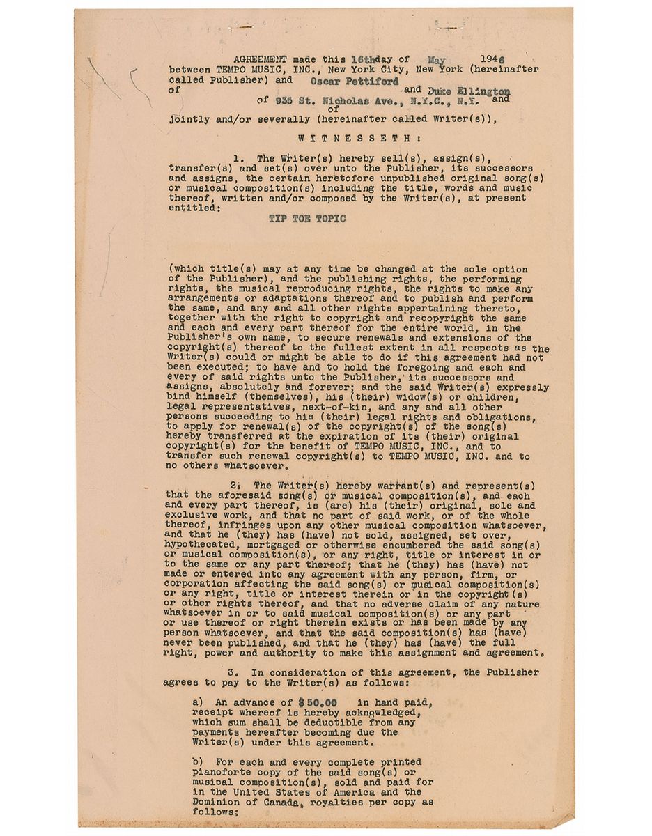 Mimeographed DS, signed in ink by Ellington, four pages, 8.5 x 14, May 16, 1946. Agreement between Oscar Pettiford and Ellington to publish the song ‘Tip Toe Topic,’ with Ellington receiving a $50.00 advance and 50% of the royalties from the sale of its music. Signed on the last page by Ellington, as well as by Pettiford. In very good condition, with uniform toning, a bit heavier to edges, staple holes to top edges, and some small edge tears.