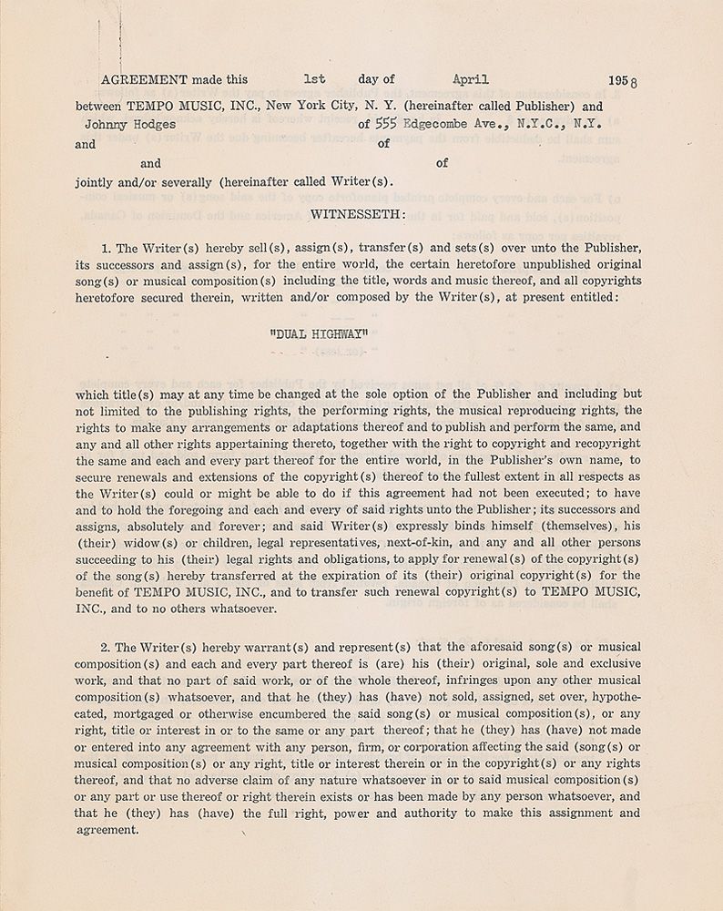 DS, four pages both sides, 8.5 x 11, April 1, 1958. Agreement between Johnny Hodges and Ellington’s company Tempo Music, with Tempo agreeing to publish the song ‘Dual Highway’ with Hodges receiving 100% of the royalties. Signed on the last page by Ellington. In fine condition, with a rusty paperclip impression to top edge.