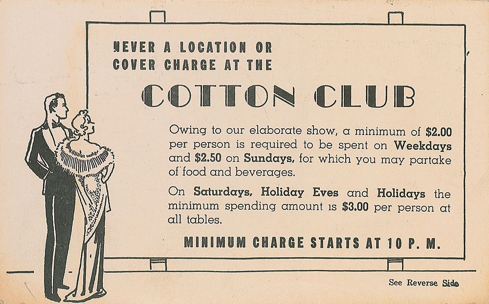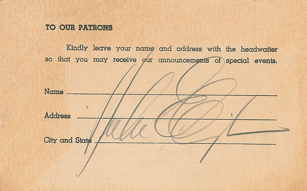Sign-up card for patrons of the famous Cotton Club, 6 x 3.75, signed on the reverse in pencil by Ellington. In fine condition, with blocks of toning to borders from previous display.