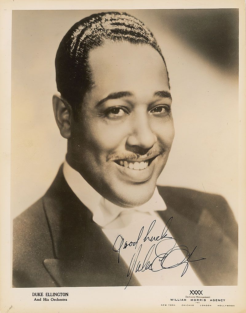 Stylish vintage glossy 8 x 10 William Morris Agency publicity photo of Ellington, signed in fountain pen, “Good luck, Duke Ellington.” In fine condition, with subtle toning to edges.