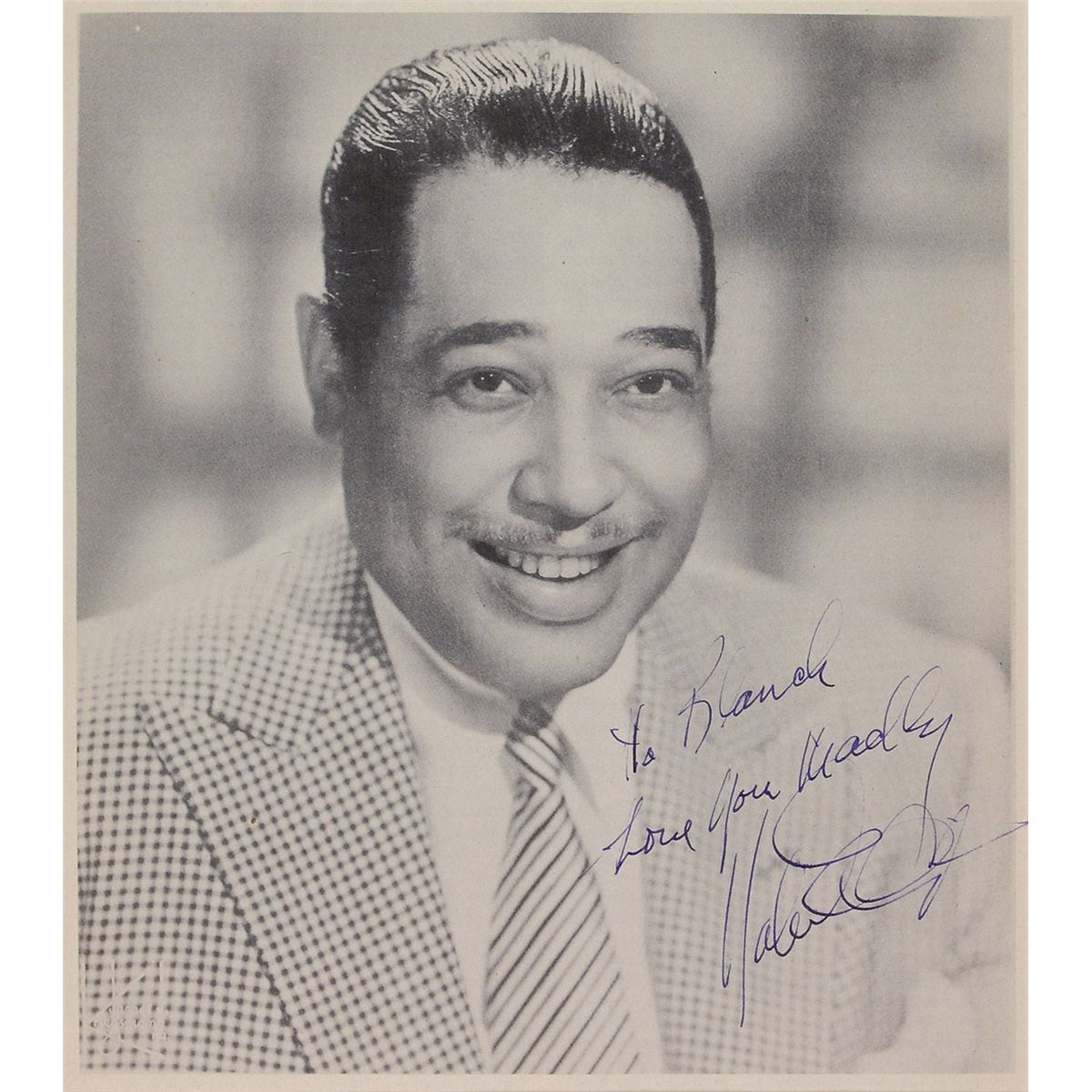 Vintage 8 x 9 paperstock head-and-shoulders photo, signed and inscribed in purple fountain pen, “To Blanch, Love you madly, Duke Ellington.” Matted to an overall size of 11.75 x 12.75. In fine condition.