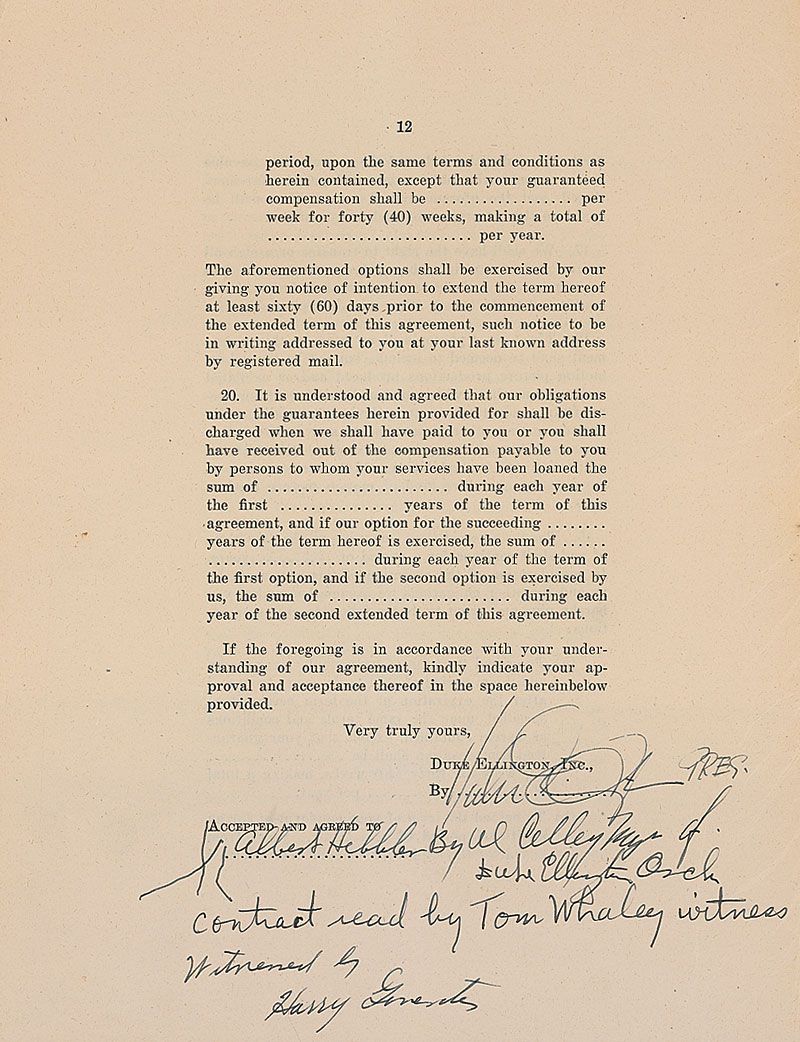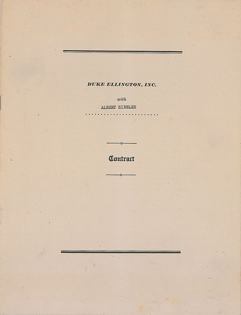 DS, 12 pages, 8.5 x 11, August 29, 1946. Exclusive employment contract hiring Al Hibbler “as a vocalist with our orchestra and as a performer in the entertainment industry…for a period of five (5) years” with an option “for an additional period of three (3) years,” being paid $150 weekly for 52 weeks per year. “Of the $150 weekly salary, $20 is for expenses.” Signed on the final page by Ellington, “Duke Ellington, Pres.,” and also signed “X” by Albert Hibbler, and next to Hibbler’s mark: “Albert Hibbler By Al Celley Mgr of Duke Ellington Orch” and “contract read by Tom Whaley witness” and another witness. In fine condition, with some mild handling wear and creasing. Accompanied by an unsigned vintage glossy 10 x 8 photo of Hibbler, a TLS referring to Hibbler’s agreement, and two unsigned contracts between Columbia Records and Hibbler.
