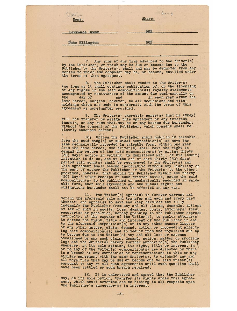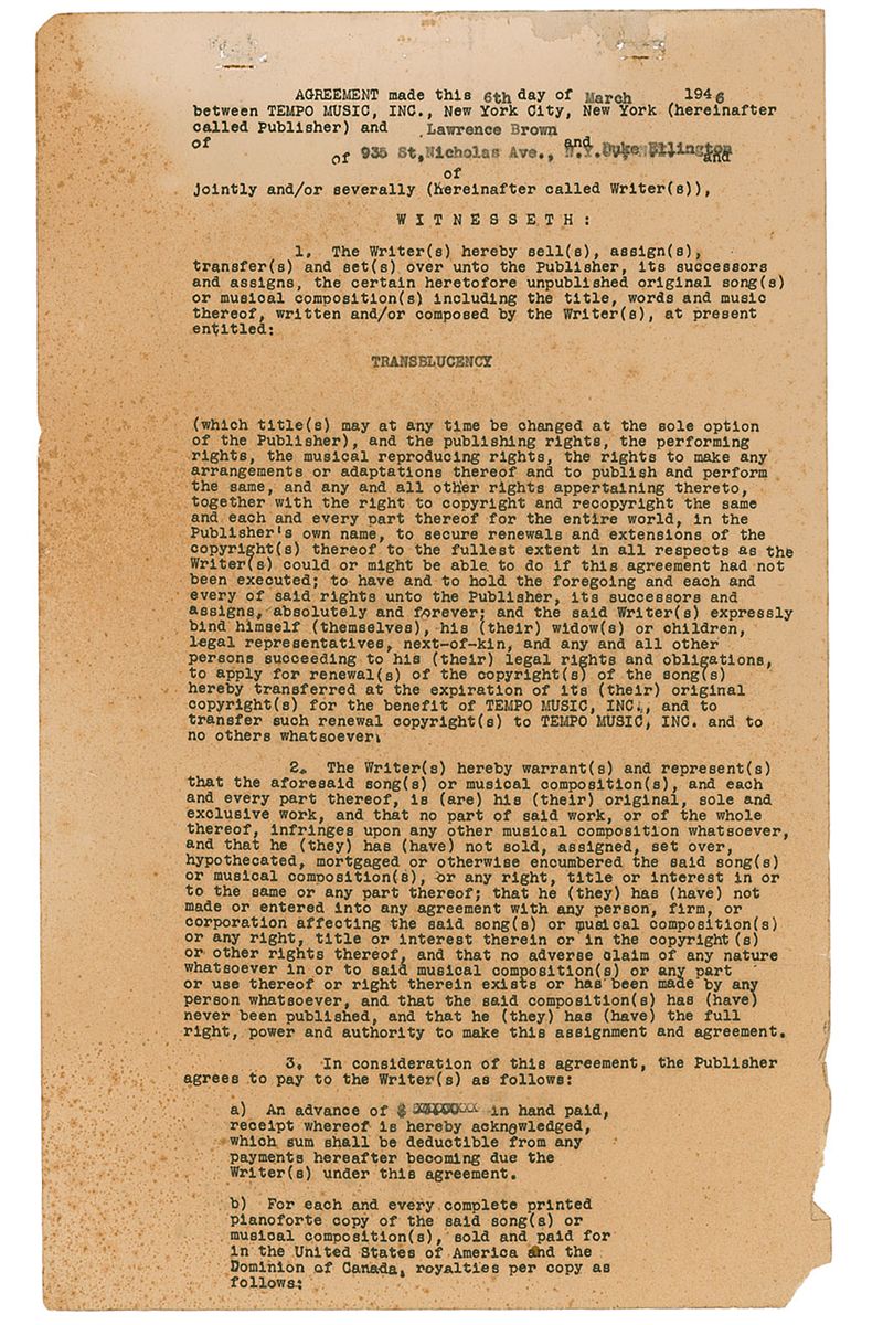 Mimeographed DS, signed in ink by Ellington, four pages, 8.5 x 14, March 6, 1946. Agreement between Lawrence Brown and Ellington’s company Tempo Music, with Tempo agreeing to publish the song ‘Transblucency’ with Brown and Ellington each receiving 50% of the royalties. Signed on the last page by Ellington and Brown, and also signed by Daniel James, “DJ.” Moderate scattered foxing to first two pages and small tears to staple holes at top, otherwise fine condition.
